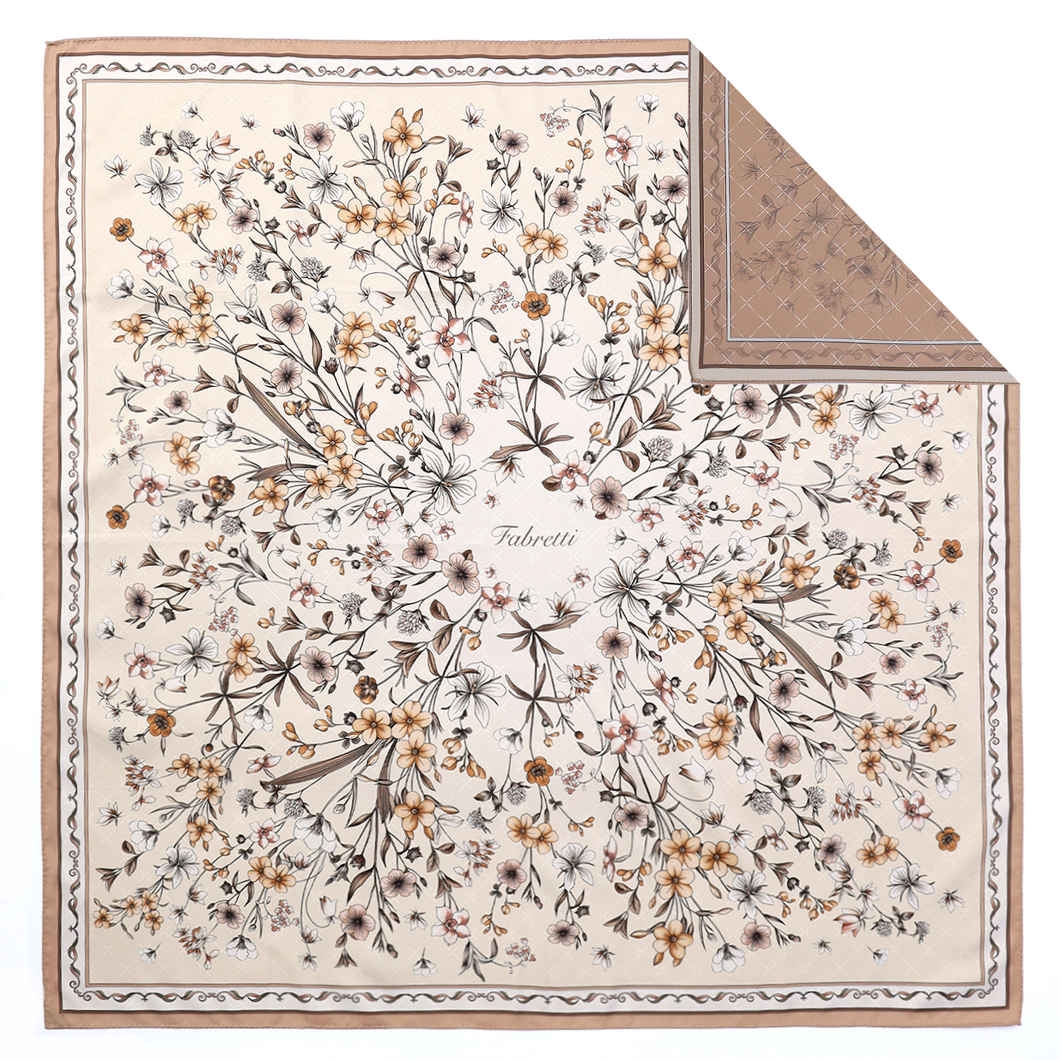 Великолепный женский платок итальянского бренда FABRETTI из искусственного шелка с узором из полевых цветов в рамке в бежево-лиловых тонах.