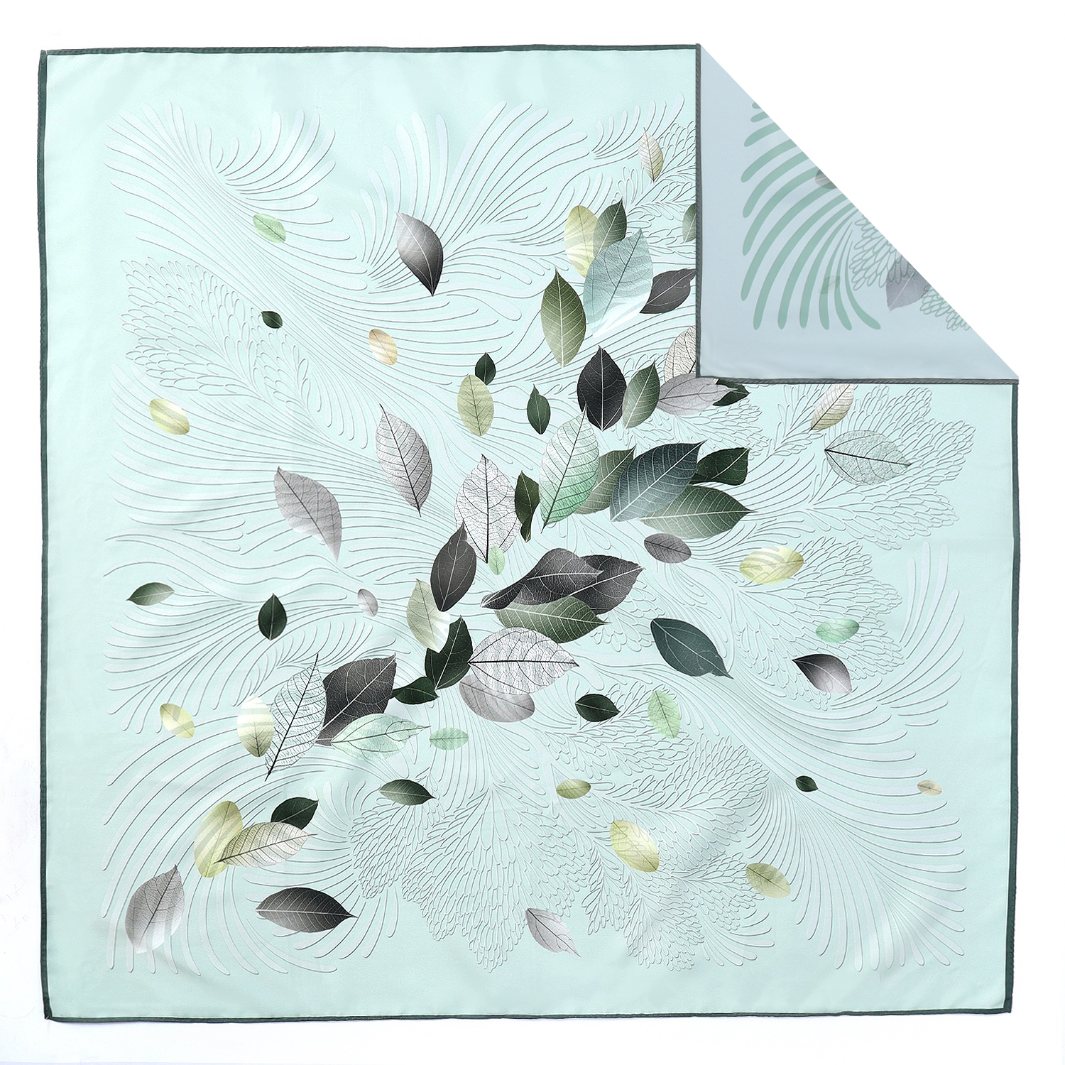 Элегантный женский платок итальянского бренда FABRETTI из искусственного шелка с узором из летящих на ветру листьев в рамке в свежей мятно-голубой гамме.