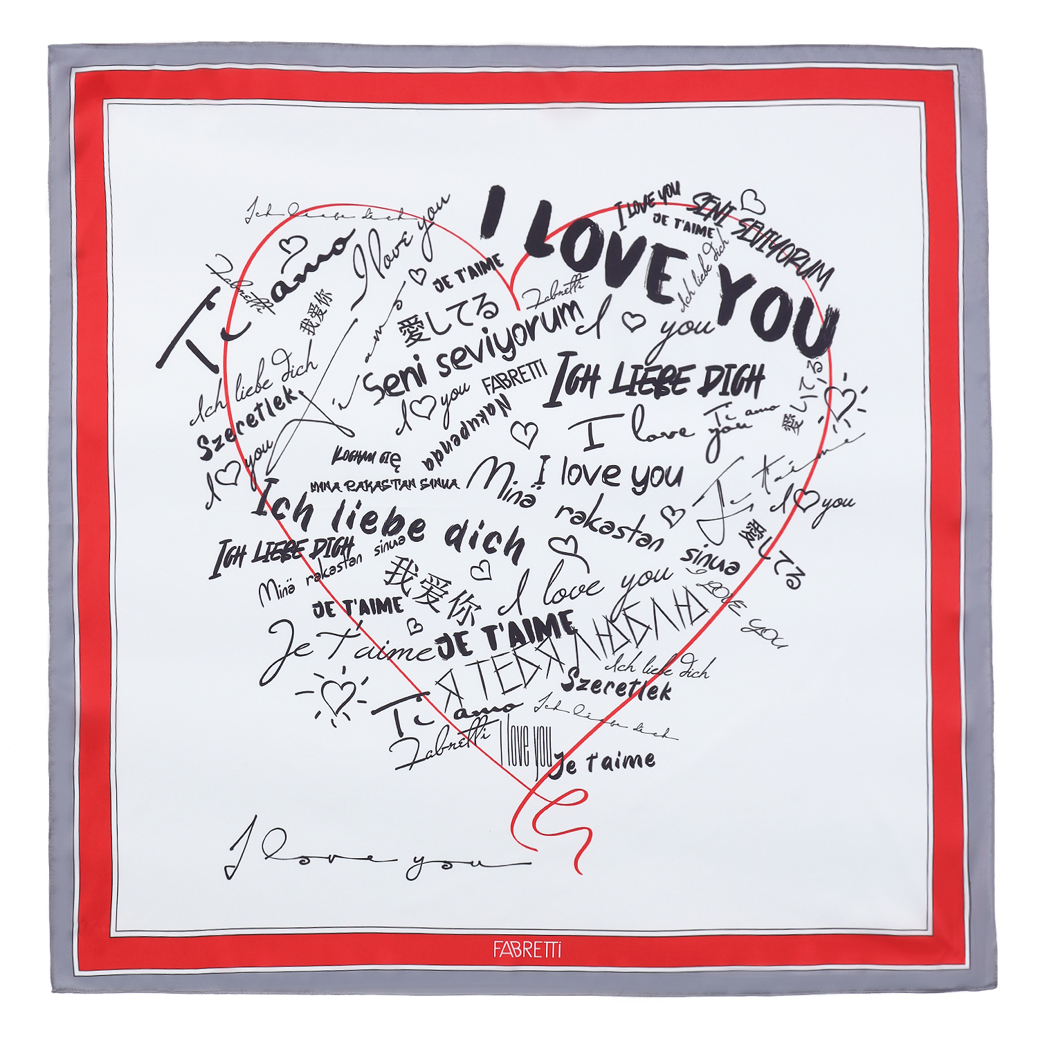 Элегантный женский платок итальянского бренда FABRETTI из искусственного шелка с романтическими надписями на разных языках, формирующими сердце, цветовой акцент – красный. Это платок станет прекрасным подарком со смыслом.