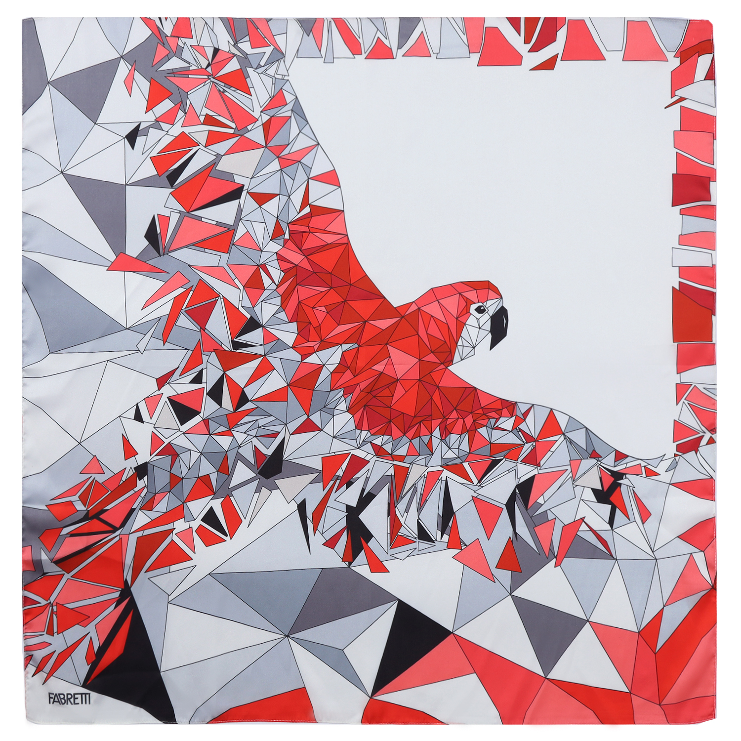 Стильный и эффектный женский платок итальянского бренда FABRETTI из искусственного шелка в ярком красном и нейтральном сером оттенках украшен оригинальным геометрическим узором, складывающимся в изображение попугая. «Мозаика» из разноцветных треугольников поможет придать образу динамичность, украсить однотонный гардероб или собрать воедино несколько цветных предметов гардероба.