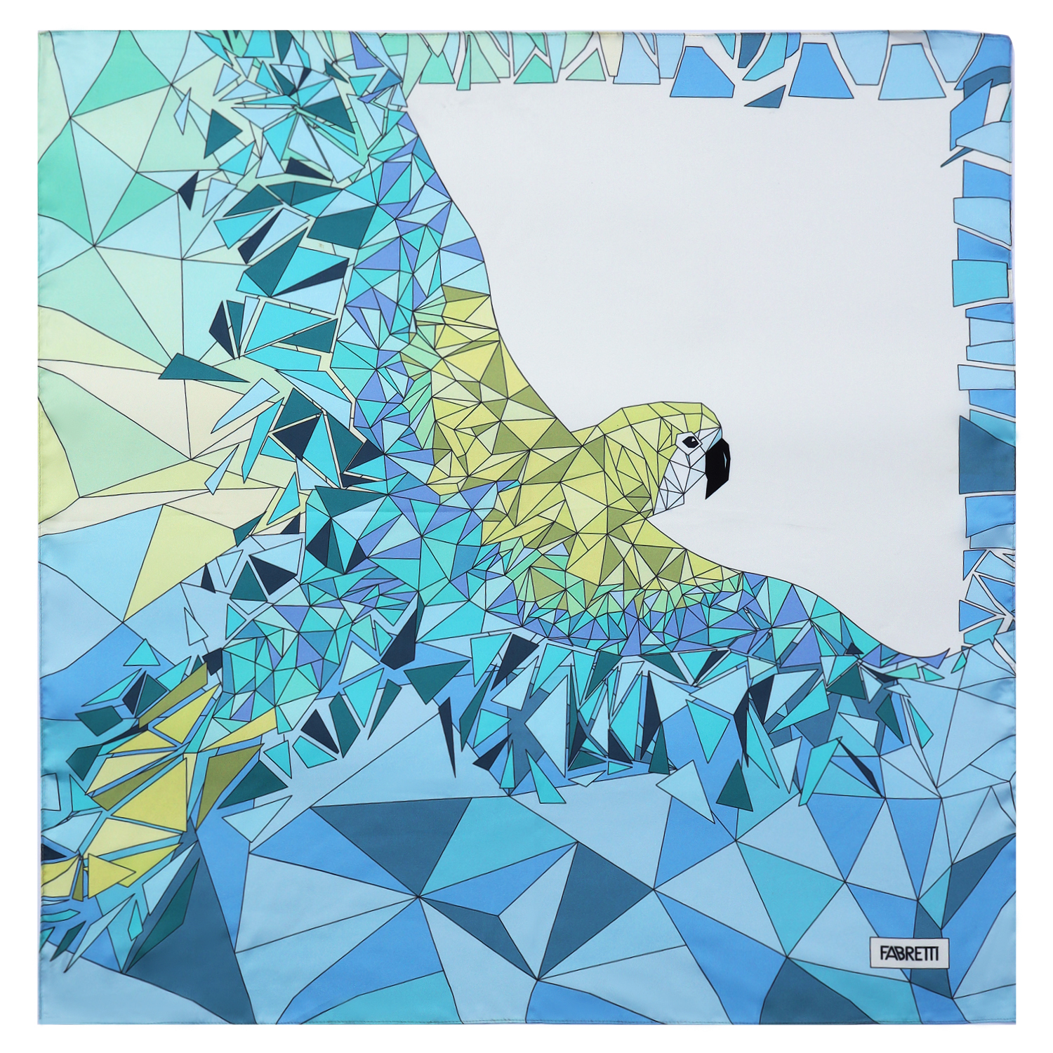Стильный и эффектный женский платок итальянского бренда FABRETTI из искусственного шелка в нежных оттенках голубого и зеленого украшен оригинальным геометрическим узором, складывающимся в изображение попугая. «Мозаика» из разноцветных треугольников поможет придать образу динамичность, украсить однотонный гардероб или собрать воедино несколько цветных предметов гардероба.