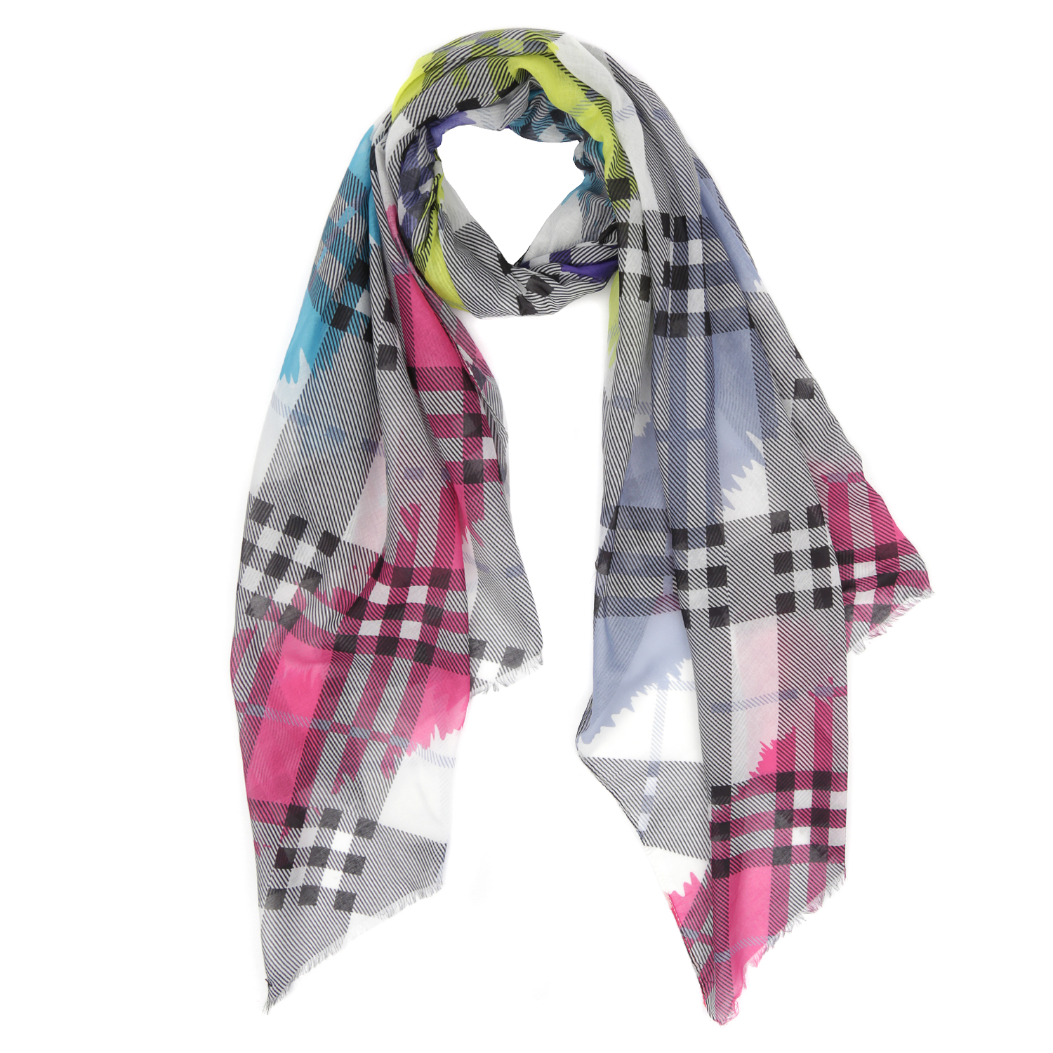 Стильный шарф FABRETTI из качественного полиэстера и обладает приятной текстурой. Изделие выполнено в черно-белой гамме, дополненной яркими акцентами в розовом и желтом оттенках. В качестве декора выбран узор "клетка". Шарф дарит ощущение комфорта, легко драпируется, долго сохранит форму и цвет. Концы украшены аккуратными ресничками.