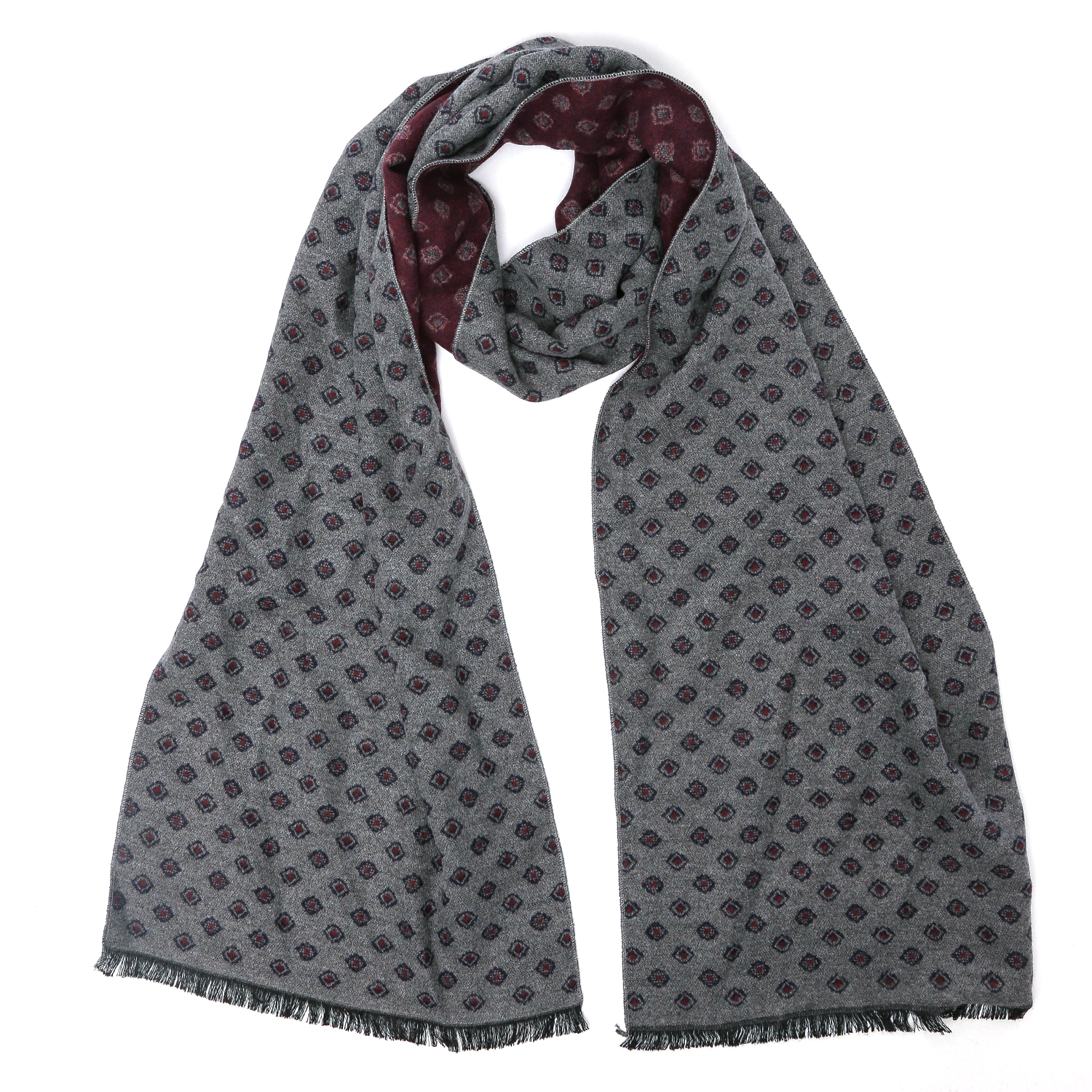 Двусторонний мужской шарф FABRETTI выполнен из 100% вискозы, прекрасно держит форму и обладает мягкой фактурой. Вискоза отлично сохраняет тепло и не образует статического электричества. Модель декорирована геометрическим узором. Одна сторона - в бордовом оттенке, другая - в сером, что позволяет сочетать аксессуар как с деловым, так и повседневным образом. Прекрасный вариант для осени и европейской зимы. Аккуратные реснички на краях придают изделию законченный вид. Размер 30*192 см.