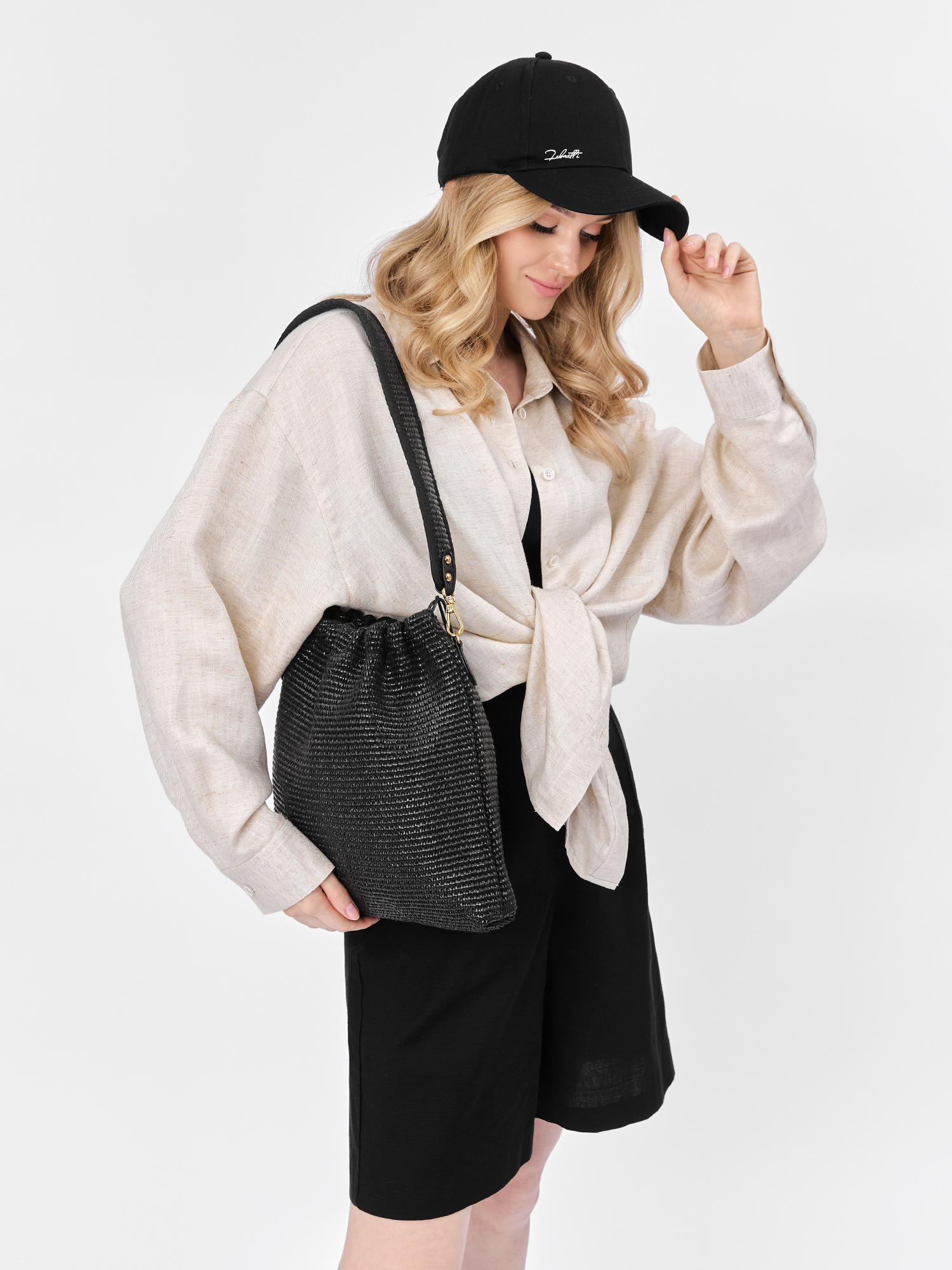 Простая, но оригинальная модель, в стиле «осознанной моды», выглядит стильно и естественно. Верх сумки утягивается кулиской с текстильным шнурком. Внутри одно отделение с двумя небольшими открытыми карманами.