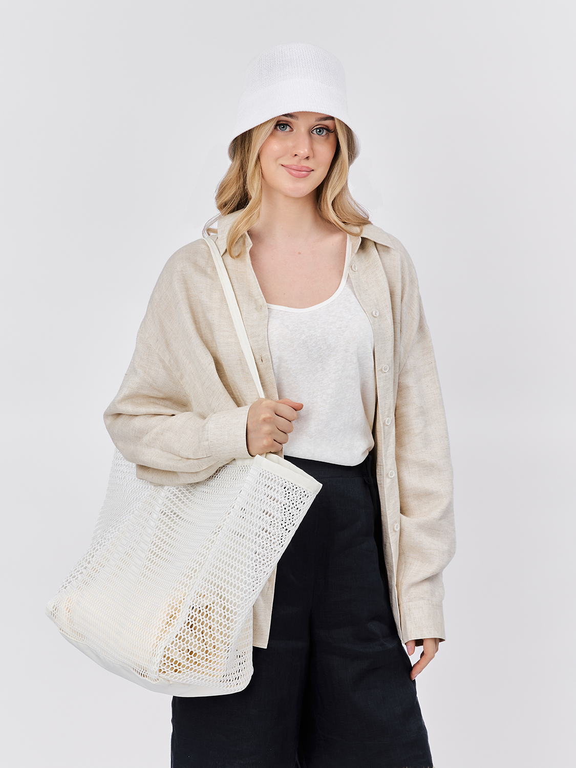 Летняя женская сумка итальянского бренда FABRETTI из белой сетки – пляжный вариант с минимальным декором. Это большая, вместительная сумка с плоским дном и карманом на молнии выполнена из перфорированного материала с узором сотами. Тонкие текстильные ручки подходят для ношения сумки на плече или в руках.