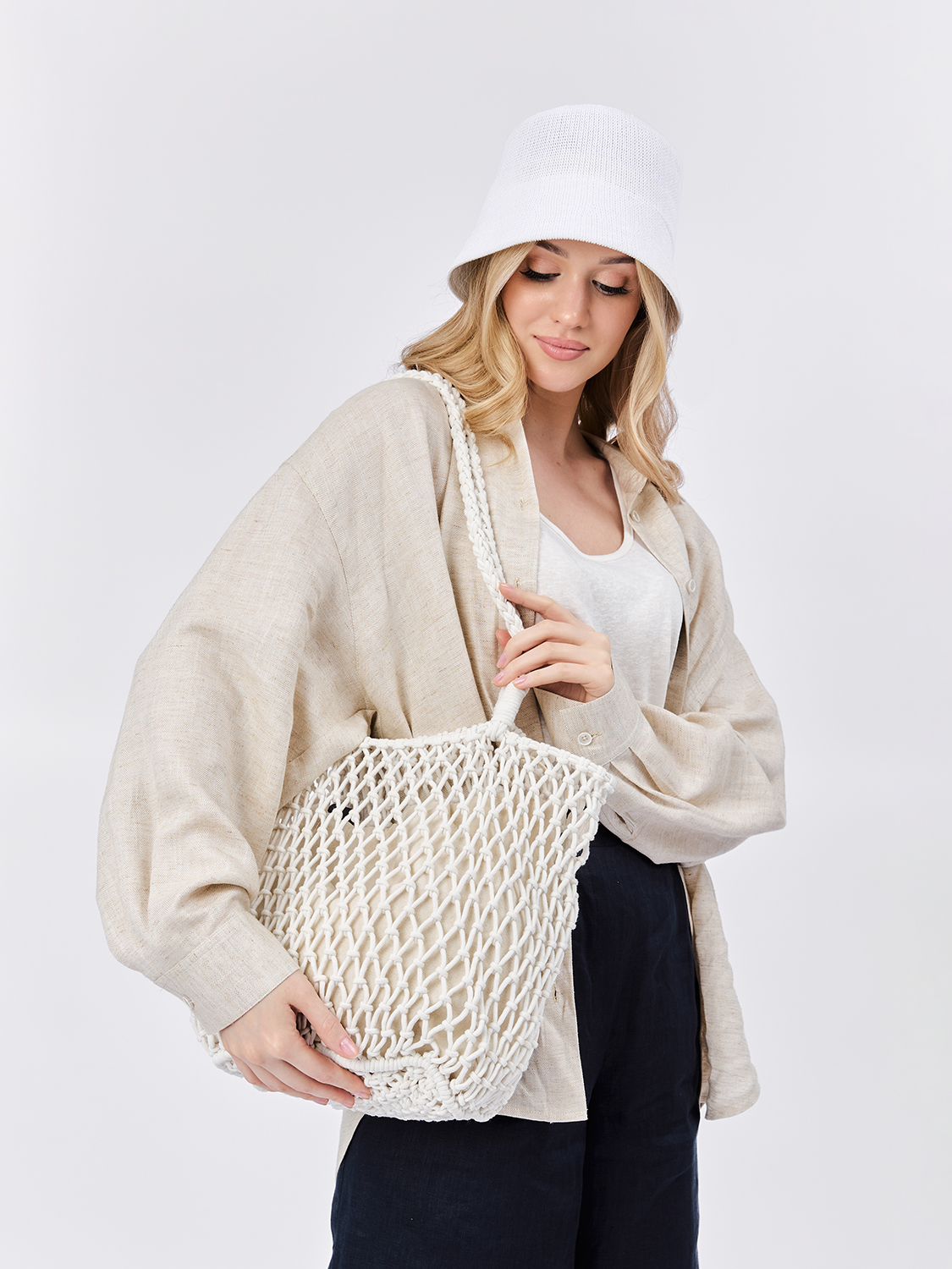 Необычная женская сумка тоут итальянского бренда FABRETTI, выполненная в технике макраме в белом цвете. Эта модель смотрится броско и оригинально – с одной стороны, узнаваемое плетение в стиле «авоськи», с другой – оригинальный дизайн, широкое прямоугольное дно и текстильная подкладка с утягивающим шнурком. Эта модель прекрасно впишется в пляжный образ, но и в городском гардеробе она может занять достойное место.