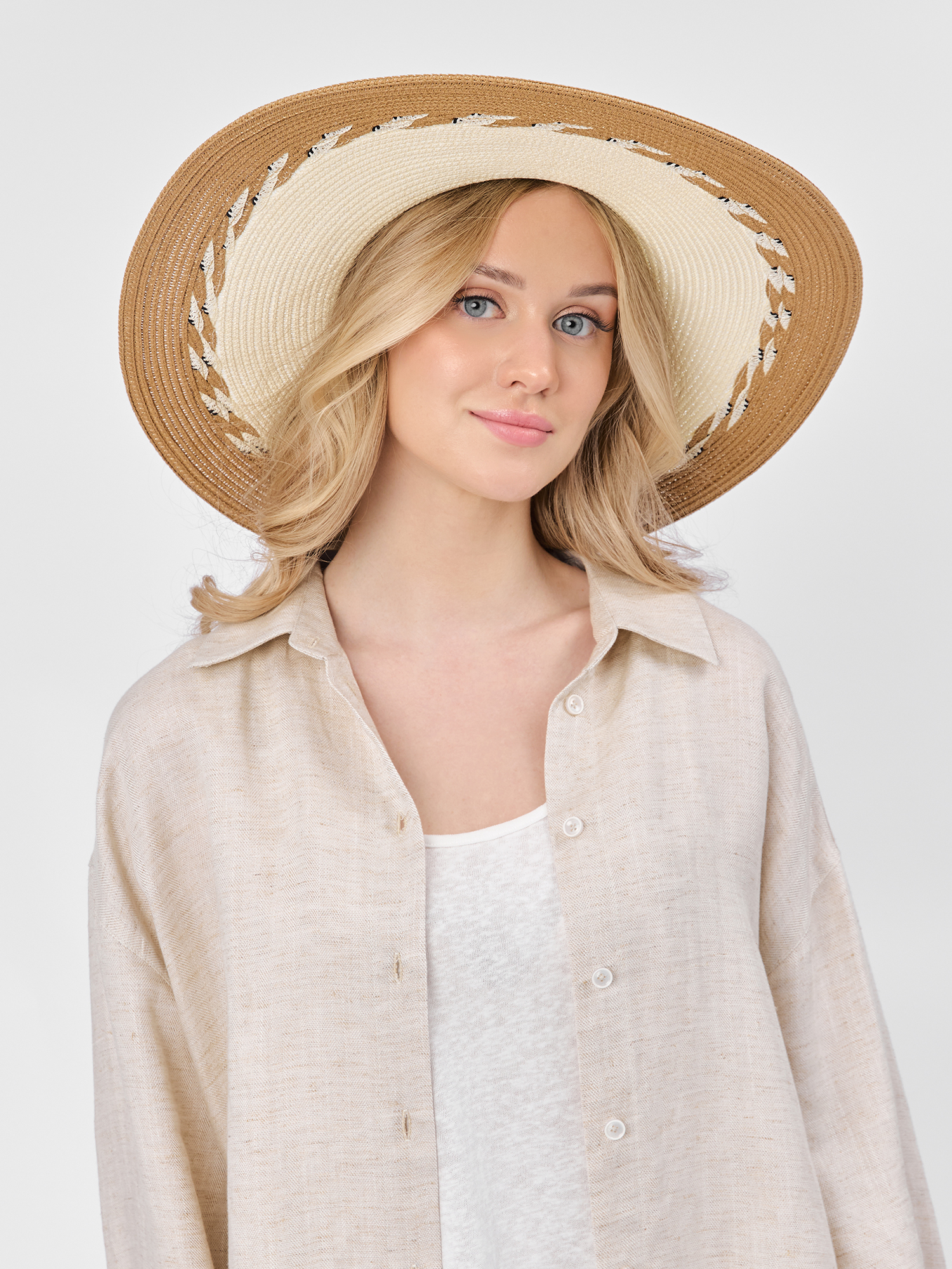 Элегантная широкополая шляпа итальянского бренда FABRETTI молочно-белого цвета с коричневой отделкой – женственный аксессуар, который идеально дополнит летний гардероб в натуральных тонах.