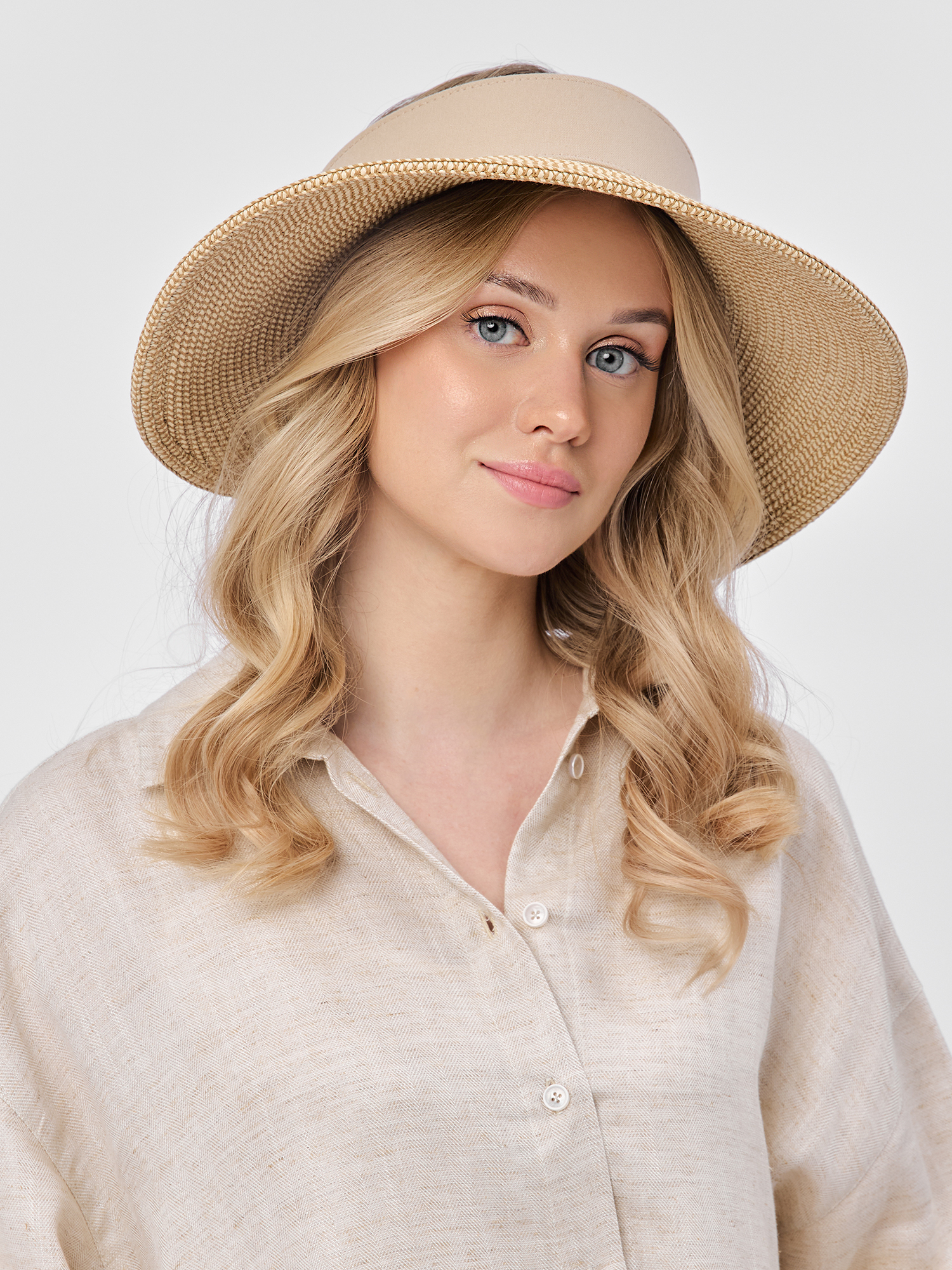 Оригинальная женская шляпа-козырек итальянского бренда FABRETTI бежевого цвета. Модель выполнена без тульи, с жестким текстильным ободком, размер которого регулируется липучкой сзади. В области лба вшита вставка из мягкого махрового материала.