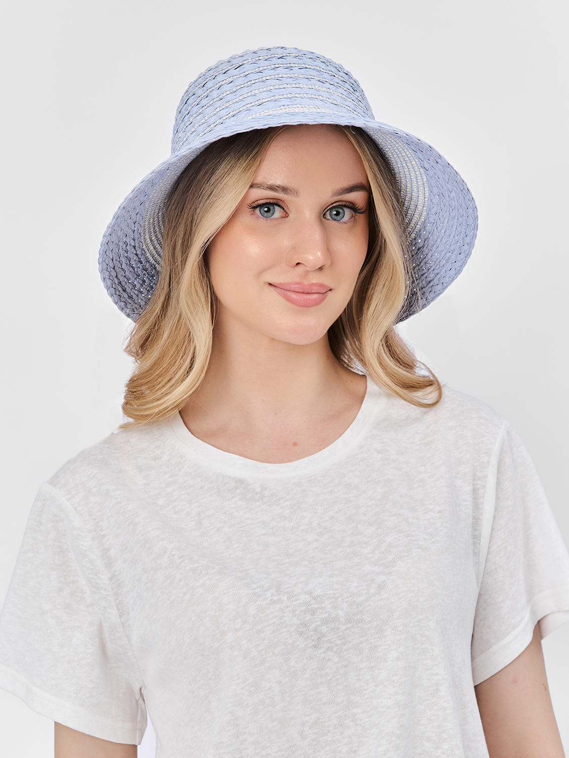 Симпатичная летняя шляпа-абажур итальянского бренда FABRETTI в бело-голубую полоску. Эта модель смотрится оригинально из-за сочетания разных типов плетения, опущенные поля прикрывают лицо.