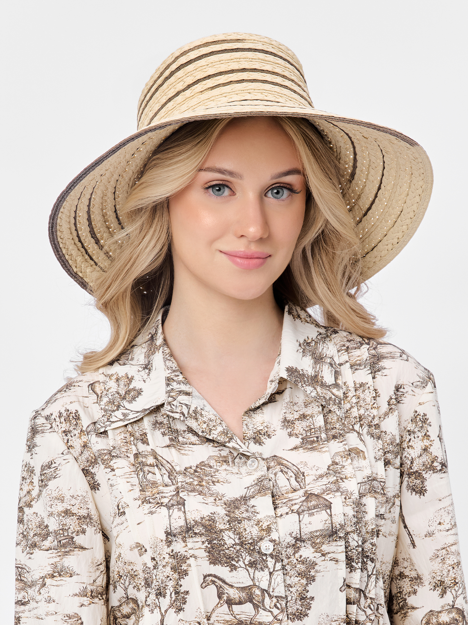 Летняя широкополая женская шляпа итальянского бренда FABRETTI в классическом песочно-бежевом цвете. Эта модель в стиле «шляпа-абажур» с опущенными широкими полями украшена узором из тонких контрастных полосок. Внутри размер шляпы регулируется лентой.