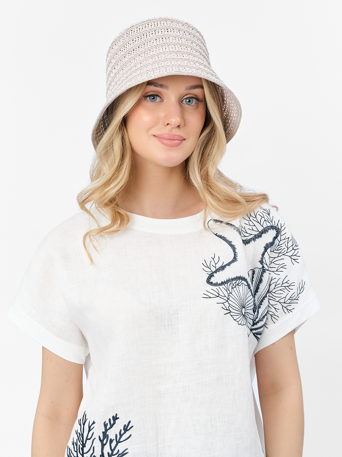 Элегантная женская шляпа итальянского бренда FABRETTI в бежевом цвете. Эта модель – шляпа-ведро с мягкими, опущенными вниз полями и округлой тульей – остается в трендах летних сезонов. Она идеально сочетается с любым стилем — от уличного до романтичного. Широкие поля защищают лицо и плечи.