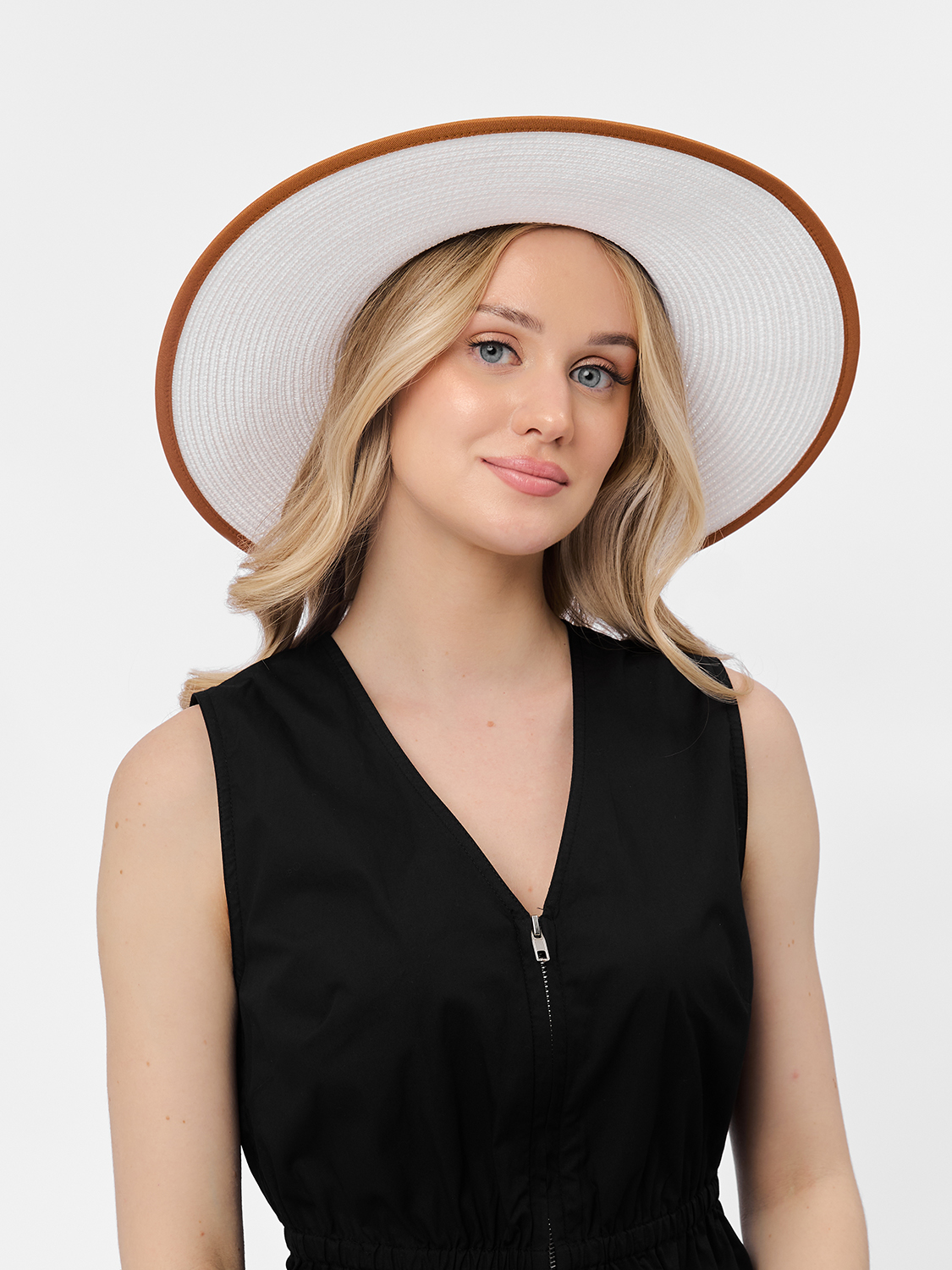 Шляпа флоппи с широкими прямыми полями прекрасно защищает от солнца, создавая на лице интригующую полутень. Двойной коричневый ремешок из экокожи на тулье и текстильный кант на полях в том же тоне структурируют силуэт шляпы, делая его более четким и позволяют сочетать шляпу с одеждой более темных тонов.