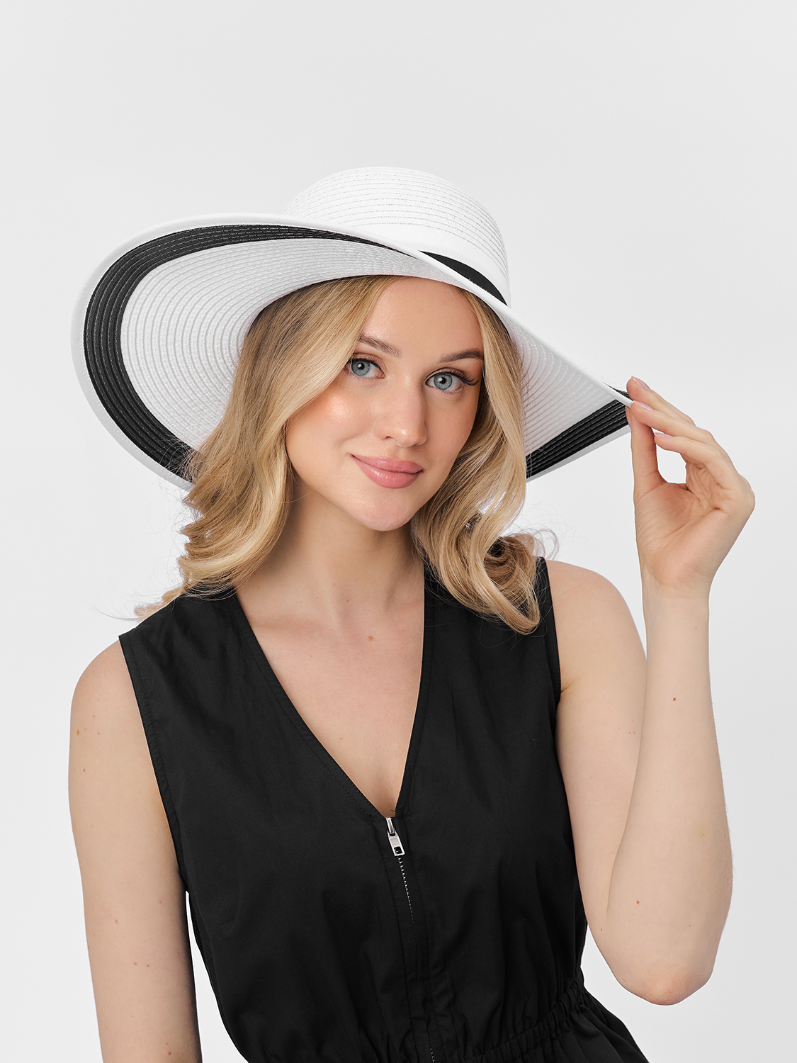 Шляпа с широкими мягкими полями защищает лицо от палящего солнца, создавая загадочную полутень. Тулью украшают две текстильных ленты – черная и белая, края полей контрастно окрашены черным. Внутри размер шляпы регулируется лентой.