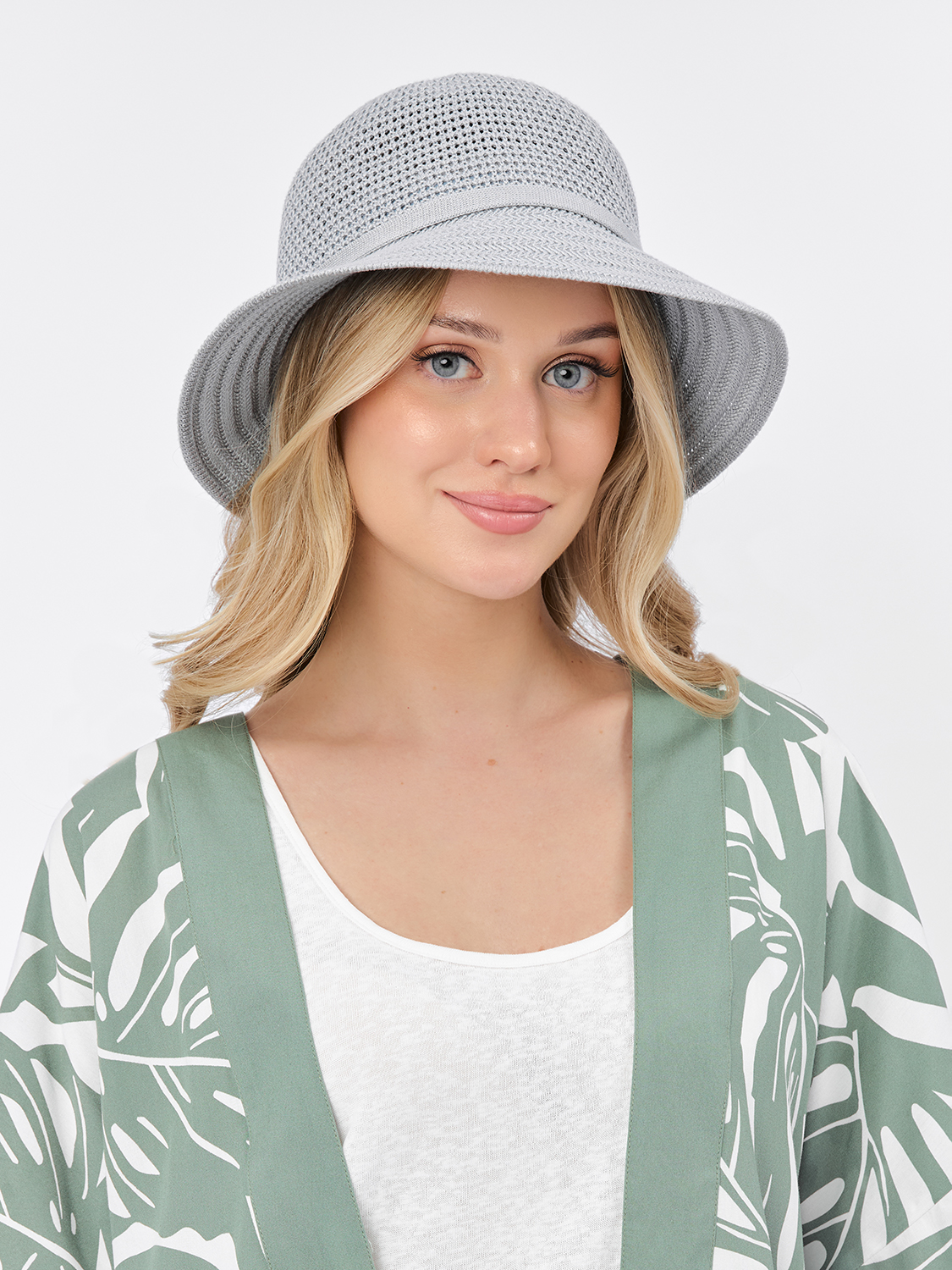 Шляпка выполнена из легких и прочных искусственных нитей в серо-голубом цвете.