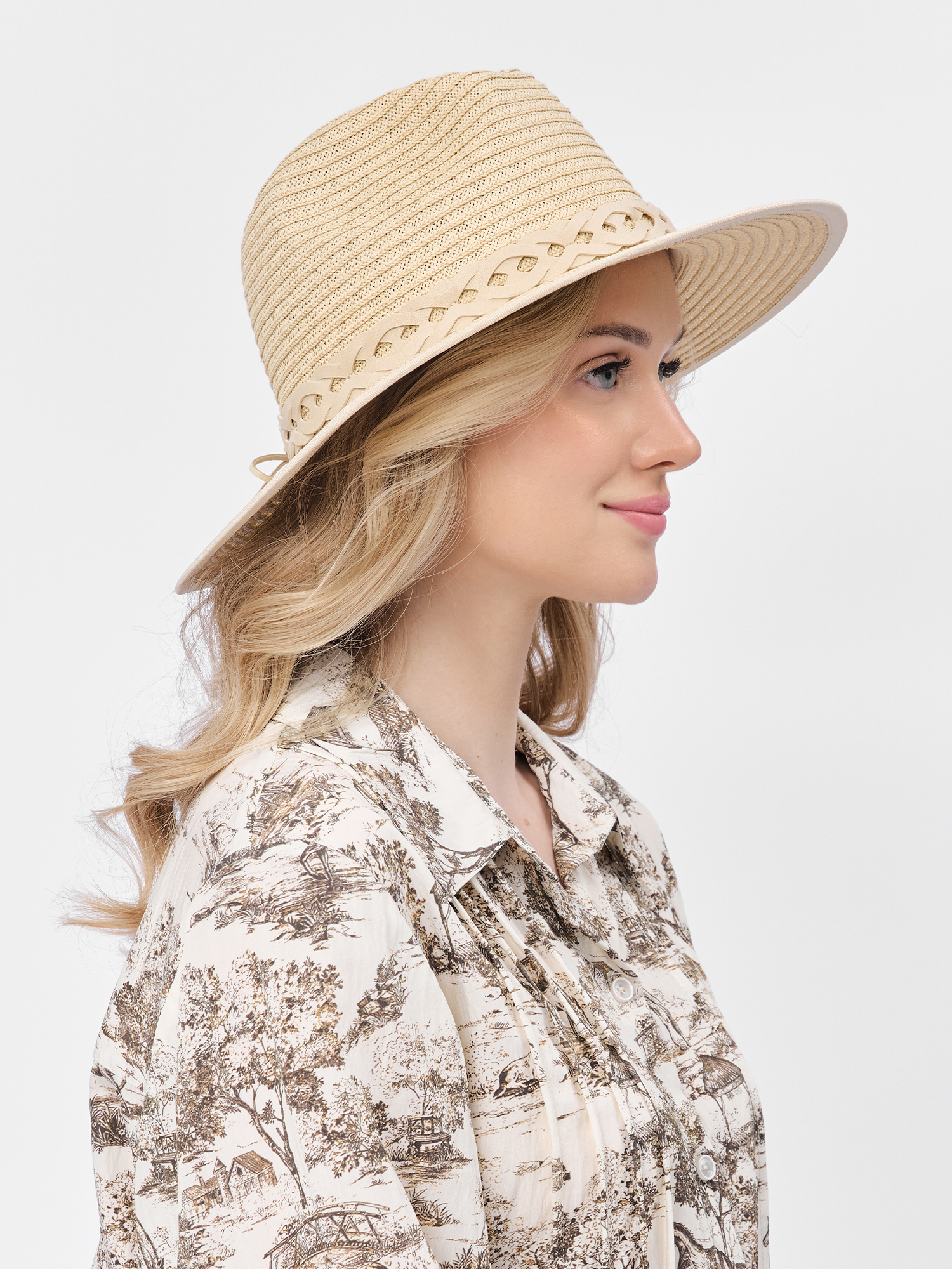 Классическая летная шляпа-федора итальянского бренда FABRETTI – любимый головной убор в городской моде. Эта универсальная женская шляпка с широкими прямыми полями сочетается практически со всем – от купальников и бохо до строгих брючных костюмов. Тулья украшена плетеной лентой из экокожи, край полей окантован текстильной лентой в тон. Внутри размер регулируется лентой.