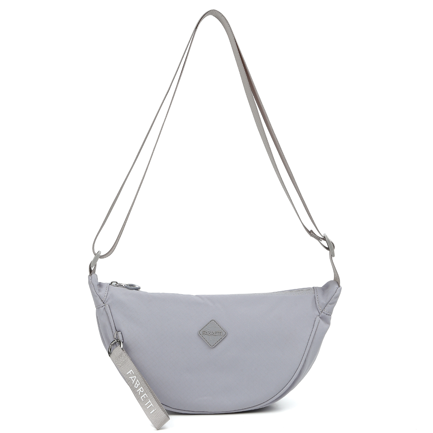 Текстильная сумка кросс-боди FABRETTI в сером оттенке выполнена из высокотехнологичного влагостойкого полиэстера легкой жатой фактуры. Он практичен и прост в уходе. Основное отделение закрывается на молнию с удобным поводком. Внутри есть 1 карман на молнии для мелочей. На тыльной стороне предусмотрен карман быстрого доступа на молнии. Текстильный плечевой ремень регулируется по длине, ширина - 3 см. В комплект входит текстильный брелок.