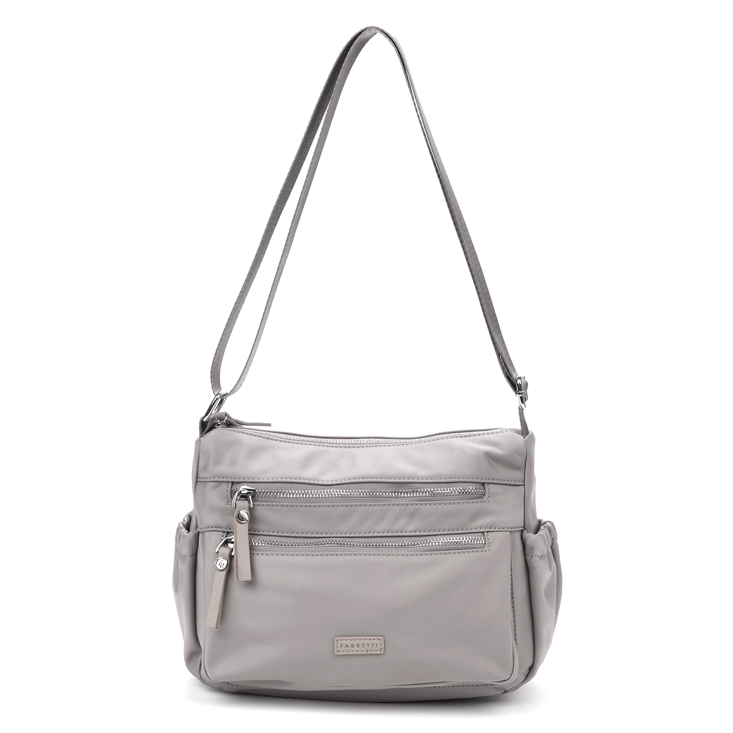 Женская сумка кросс-боди из коллекции итальянского бренда FABRETTI в нежном сером оттенке с бежевыми нотками с продуманным функциональным дизайном.