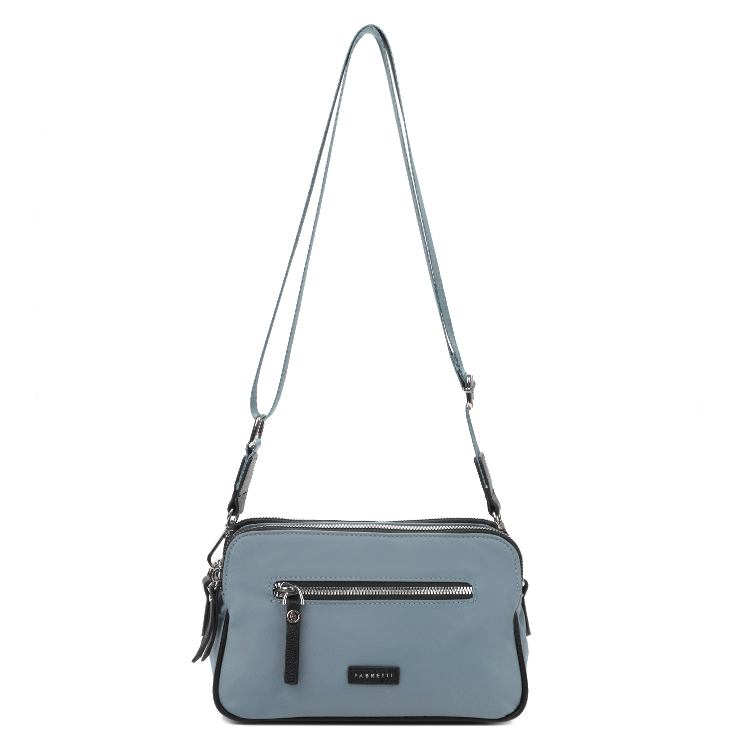 Миниатюрная женская сумка кросс-боди из коллекции итальянского бренда FABRETTI в легком небесно-голубом оттенке. Лаконичная модель с четкой геометрией форм – черная отделка по краю и вдоль молний формирует строгий прямоугольный силуэт. Дополняют декор поводки молний и крепления ремня из черной экокожи. Сам ремень съемный, регулируемый из текстильной ленты, длина 130см.