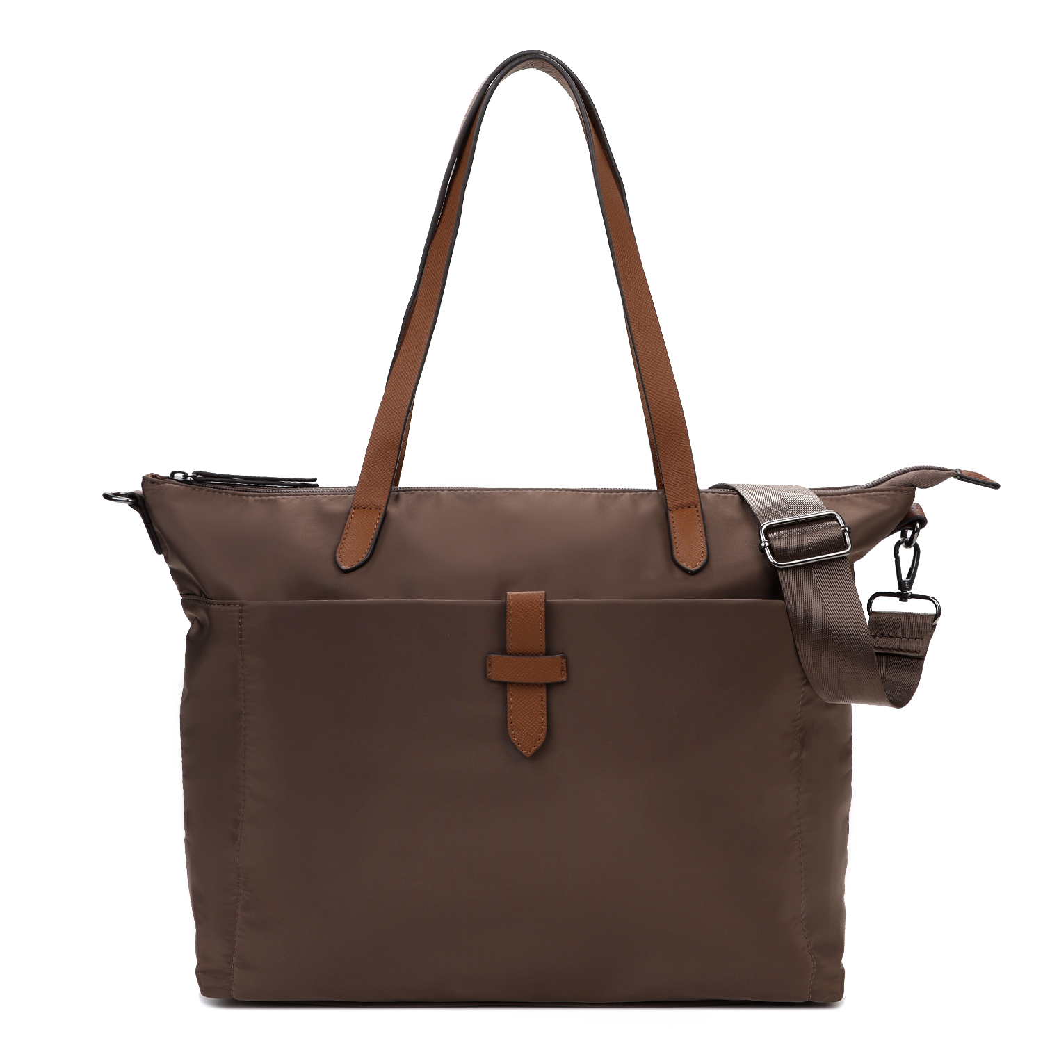 Вместительная женская сумка-тоут из коллекции итальянского бренда FABRETTI в холодном шоколадном оттенке. Основное отделение закрывается на молнию. У сумки одно отделение с большим открытым карманом и мягким карманом для планшета на липучке. На лицевой стороне вместительный карман на молнии, украшенный ремешком из экокожи. На тыльной стороне карман быстрого доступа на молнии. Сумка дополнена ручками из экокожи и съемным регулируемым текстильным ремнем на карабинах.