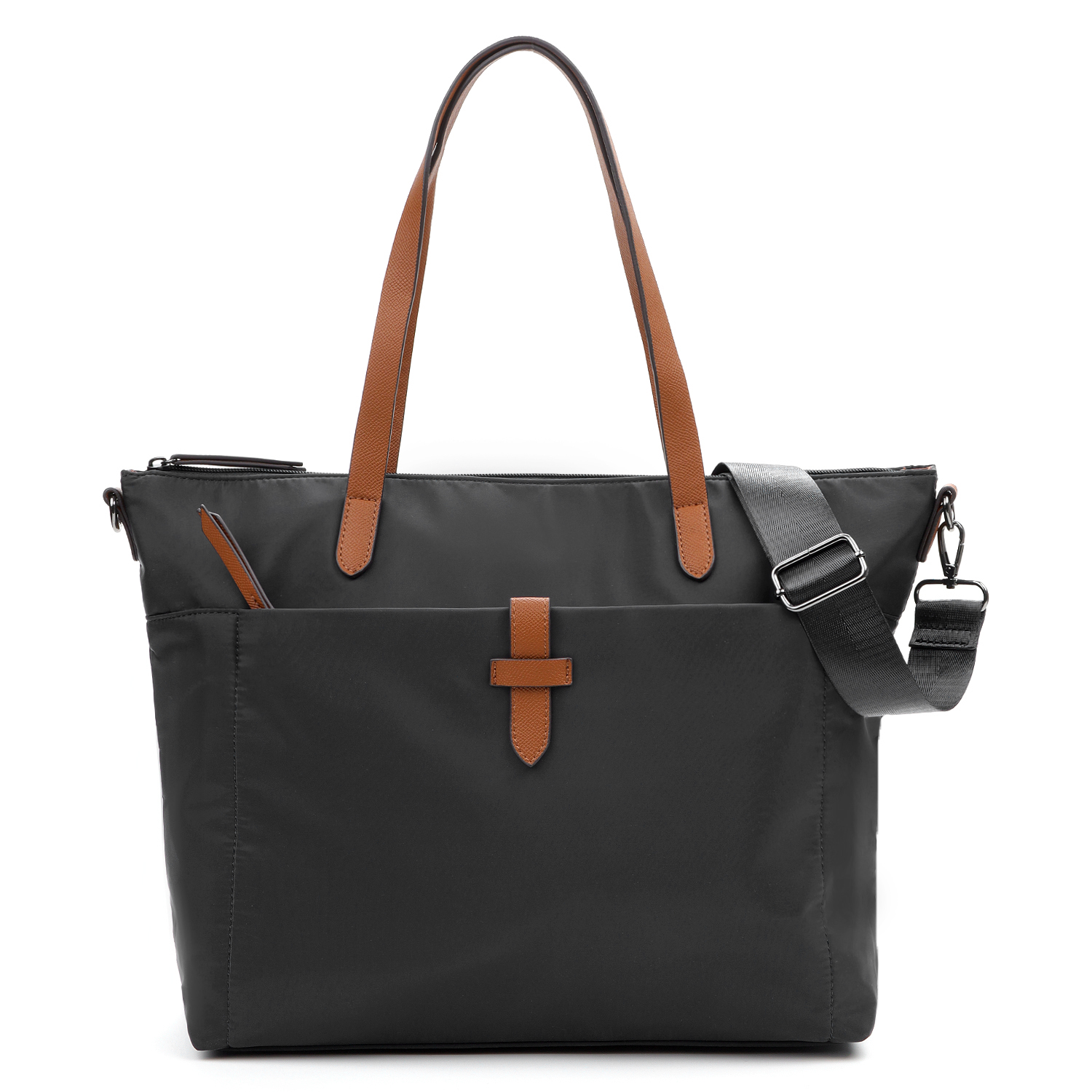 Вместительная женская сумка-тоут из коллекции итальянского бренда FABRETTI в классическом черном оттенке. Основное отделение закрывается на молнию. У сумки одно отделение с большим открытым карманом и мягким карманом для планшета на липучке. На лицевой стороне вместительный карман на молнии, украшенный ремешком из экокожи. На тыльной стороне карман быстрого доступа на молнии. Сумка дополнена ручками из экокожи и съемным регулируемым текстильным ремнем на карабинах.