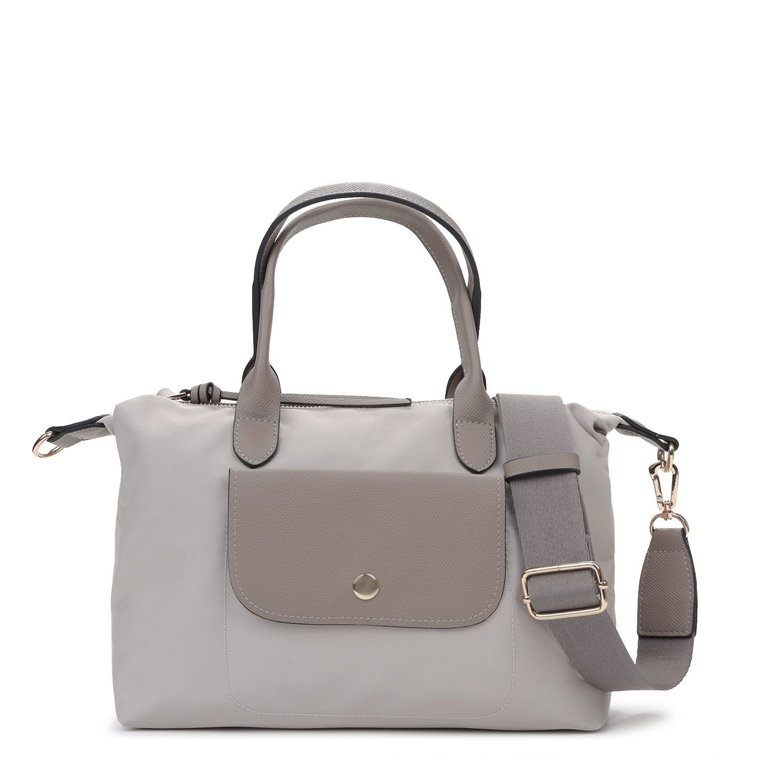 У сумки одно отделение, закрывающееся на молнию. Внутри два кармана – открытый и на молнии. На лицевой стороне открытый карман с клапаном на кнопке, на тыльной – карман быстрого доступа на молнии. Сумка дополнена двумя видами съемных ручек – короткими ручками из экокожи и регулируемым текстильным плечевым ремнем.