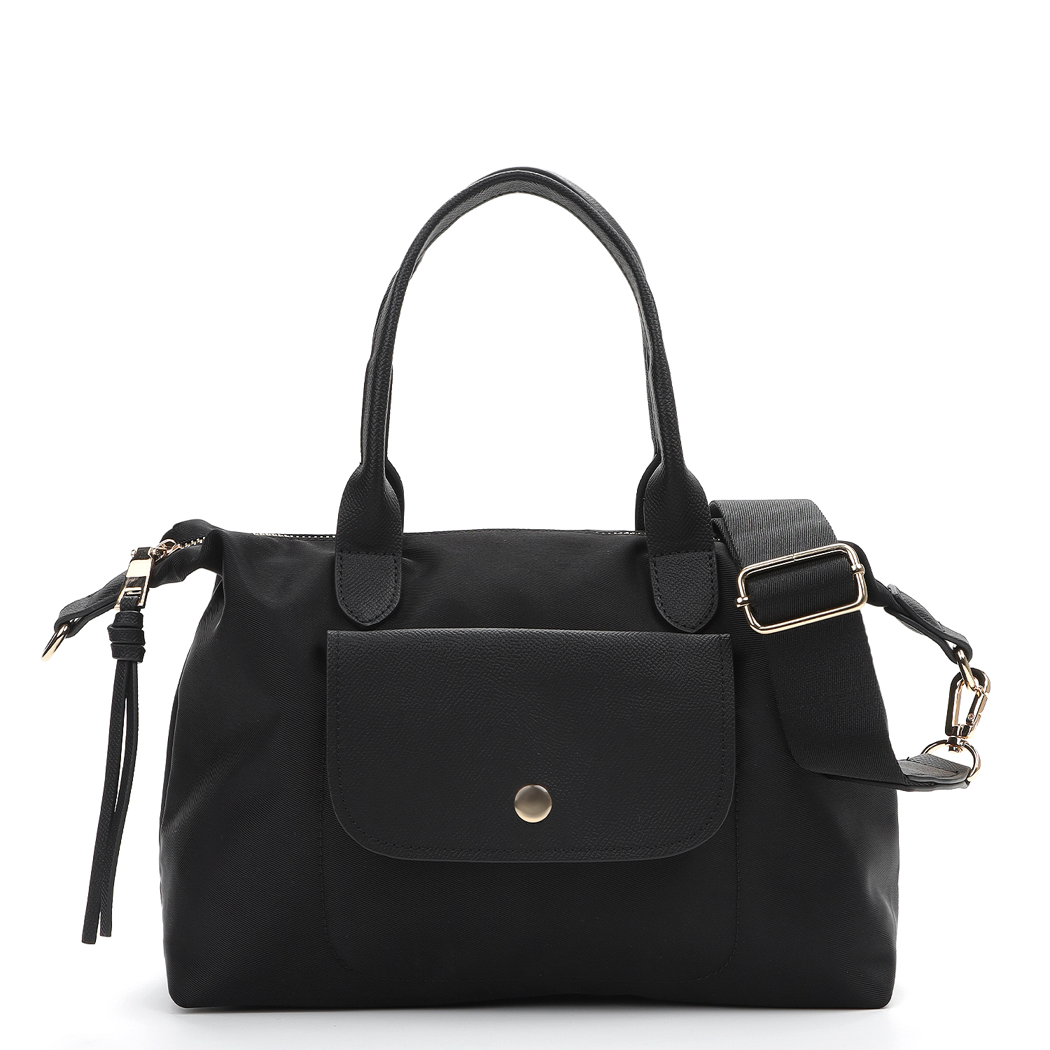 У сумки одно отделение, закрывающееся на молнию. Внутри два кармана – открытый и на молнии. На лицевой стороне открытый карман с клапаном на кнопке, на тыльной – карман быстрого доступа на молнии. Сумка дополнена двумя видами съемных ручек – короткими ручками из экокожи и регулируемым текстильным плечевым ремнем.