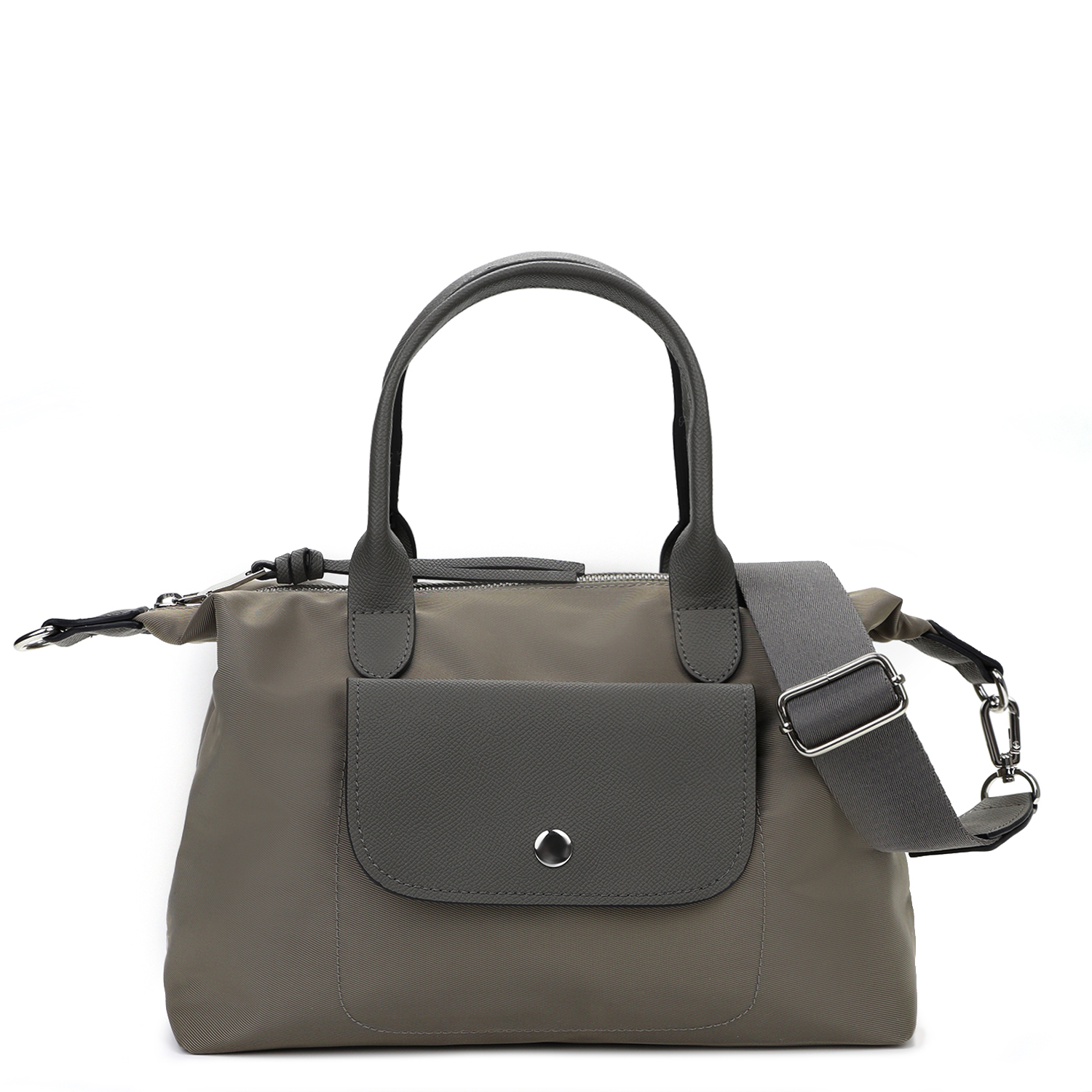 У сумки одно отделение, закрывающееся на молнию. Внутри два кармана – открытый и на молнии. На лицевой стороне открытый карман с клапаном на кнопке, на тыльной – карман быстрого доступа на молнии. Сумка дополнена двумя видами съемных ручек – короткими ручками из экокожи и регулируемым текстильным плечевым ремнем.