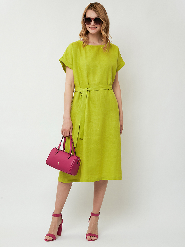 Летнее платье FABRETTI в насыщенном зеленом оттенке выполнено из 100% натурального льна – премиального материала, приятного на ощупь и обладающего гипоаллергенными свойствами. Лён не образует статического электричества, прекрасно пропускает воздух, позволяя коже дышать. Модель средней длины с короткими цельнокроеными рукавами и круглым вырезом подойдет любому типу фигуры. Съёмный пояс создает гармоничный силуэт и подчеркивает достоинства фигуры. По бокам предусмотрены врезные карманы. Платье станет любимой частью летнего гардероба, будет гармонично смотреться как в городе, так и на морском побережье.