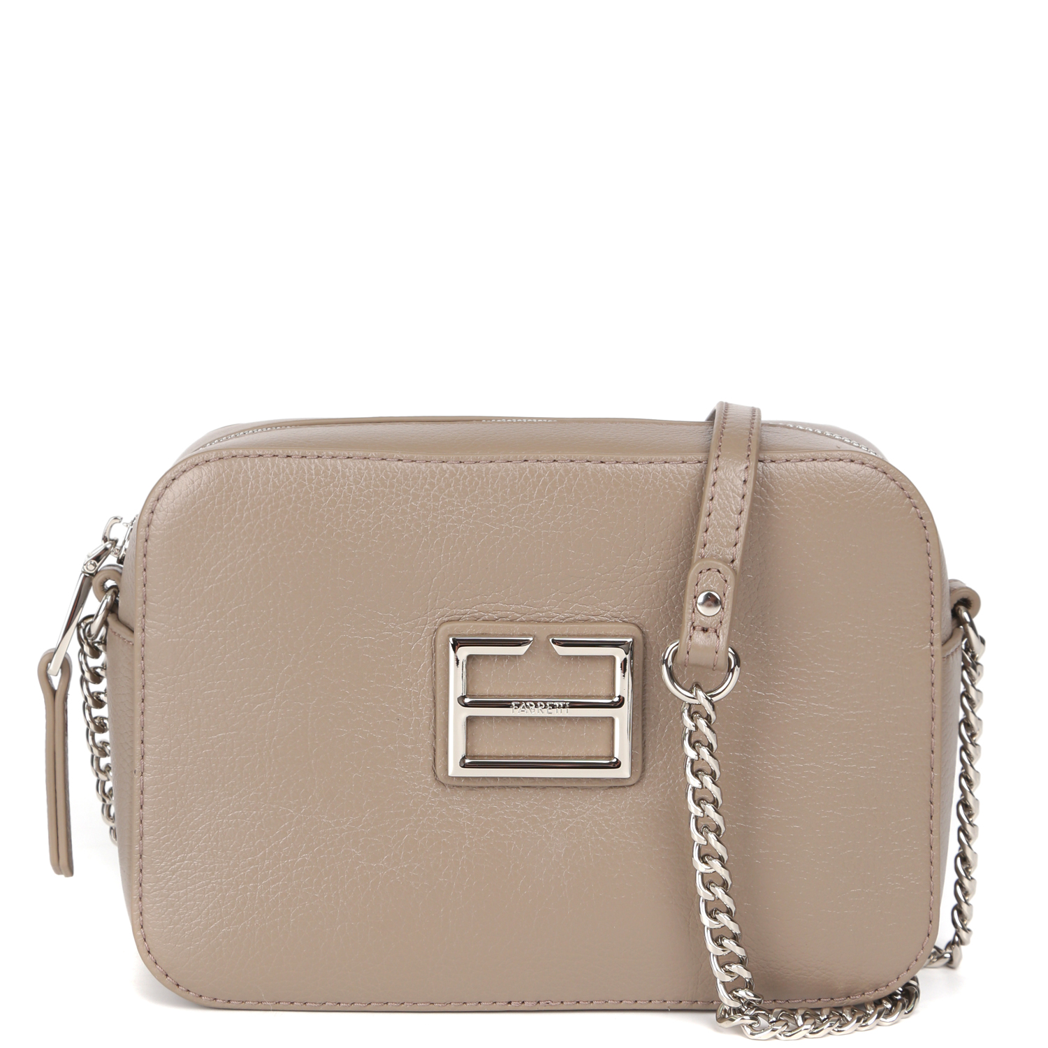 Компактная кросс-боди FABRETTI выполнена из натуральной зернистой кожи в темно-бежевом оттенке. Основное отделение закрывается на полукруглую молнию с кожаным поводком. Внутри 2 боковых кармана: открытый и на молнии. На тыльной стороне предусмотрен карман быстрого доступа на молнии. На лицевой стороне аксессуар декорирован лаконичной монограммой бренда. Изящный плечевой ремень-цепочка позволяет комфортно носить аксессуар через плечо. Цвет фурнитуры - серебро. В сумке поместятся смартфон, паспорт, небольшой кошелек, ключи, разные женские мелочи и даже маленькая книга из серии pocket-books.