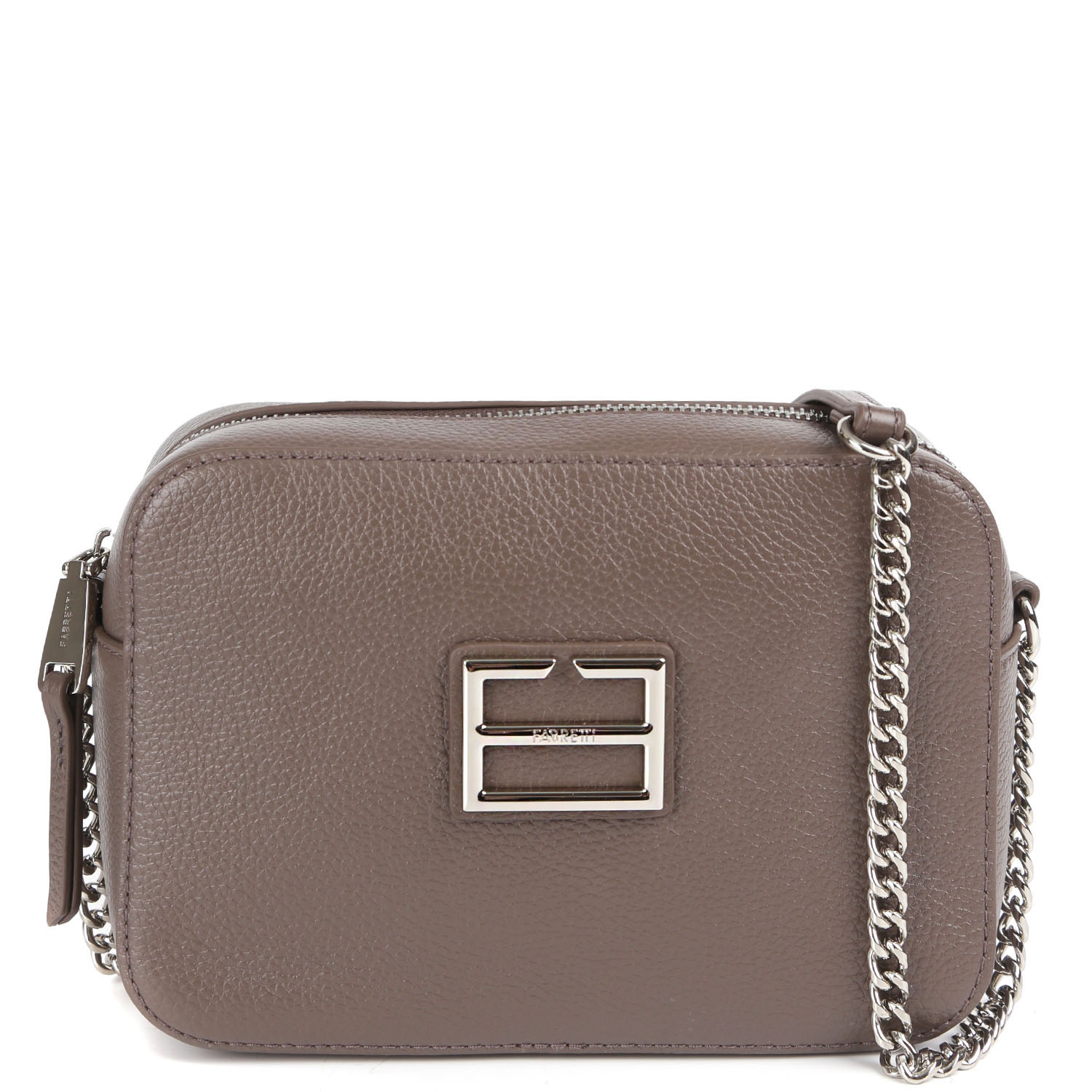 Компактная кросс-боди FABRETTI выполнена из натуральной зернистой кожи в серо-коричневом оттенке. Основное отделение закрывается на полукруглую молнию с кожаным поводком. Внутри 2 боковых кармана: открытый и на молнии. На тыльной стороне предусмотрен карман быстрого доступа на молнии. На лицевой стороне аксессуар декорирован лаконичной монограммой бренда. Изящный плечевой ремень-цепочка позволяет комфортно носить аксессуар через плечо. Цвет фурнитуры - серебро. В сумке поместятся смартфон, паспорт, небольшой кошелек, ключи, разные женские мелочи и даже маленькая книга из серии pocket-books.