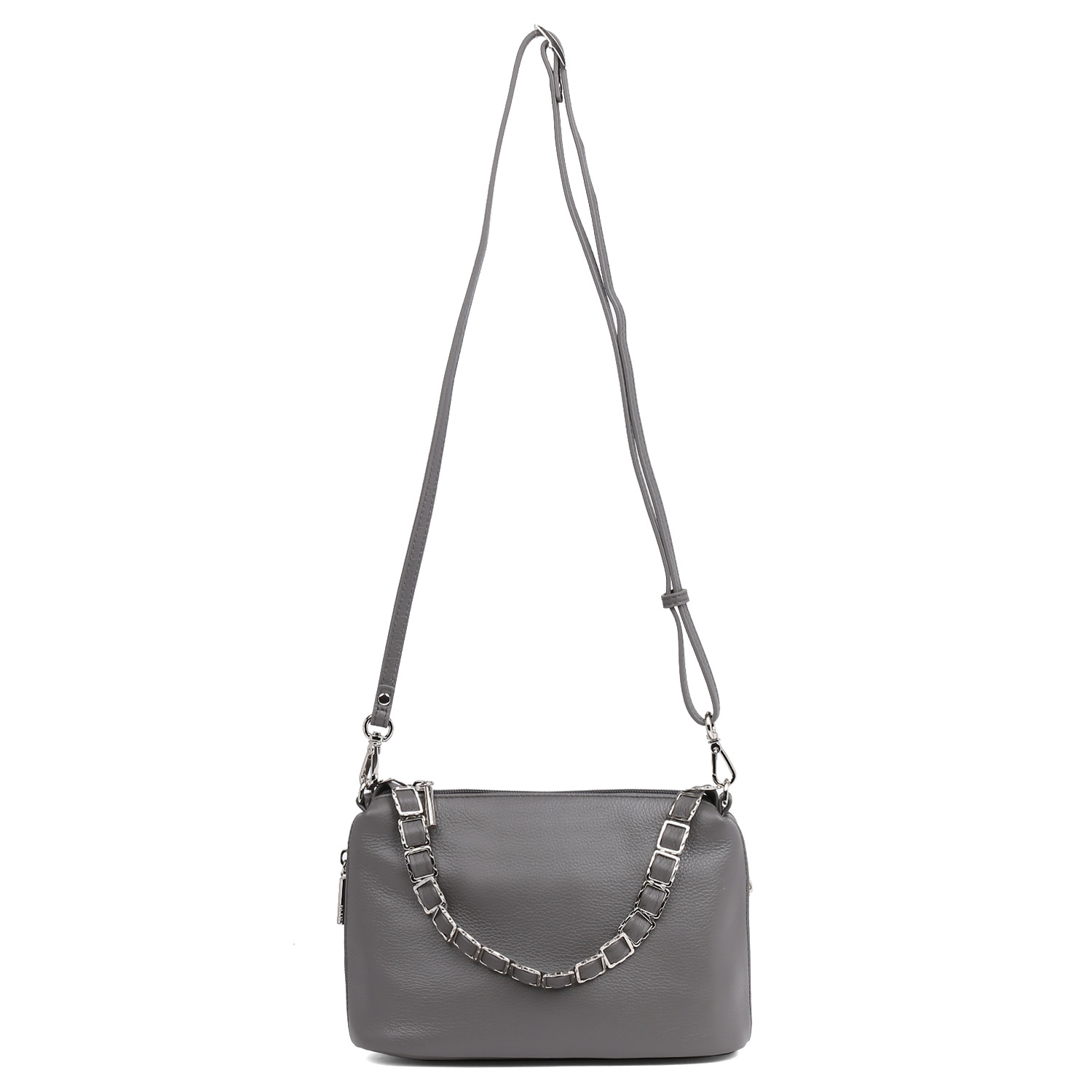 Стильная сумка через плечо от PALIO выполнена из натуральной мягкой зернистой кожи в светло-сером оттенке. Мягкая конструкция и декор на ручке делает данную модель практичной. Идеальный размер для прогулок. Основное отделение закрывается на молнию с удобным поводком. Внутри расположены 2 отсека, разделенные средником на молнии. В одном имеется карман на молнии, в другом - 2 открытых кармана для смартфона и мелочей. На внешних боковых стенках - удобные вертикальный кармашки быстрого доступа на молнии. Съемный плечевой ремень регулируется по длине.