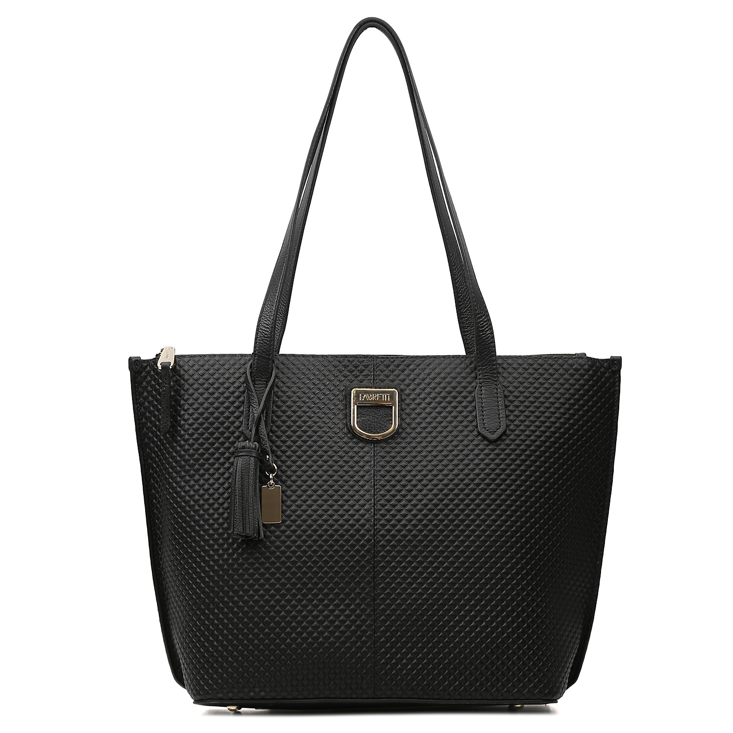 Выразительная сумка-шоппер FABRETTI выполнена из натуральной кожи с объемным геометрическим тиснением. Оригинальный дизайн и фурнитура придают модели выразительность. С таким аксессуаром женщина будет выглядеть стильно и элегантно. На тыльной стороне расположен карман на молнии. Основное отделение закрывается на молнию. Внутри находятся 3 небольших кармана на боковых стенках и вместительный карман на молнии - посредине отделения.