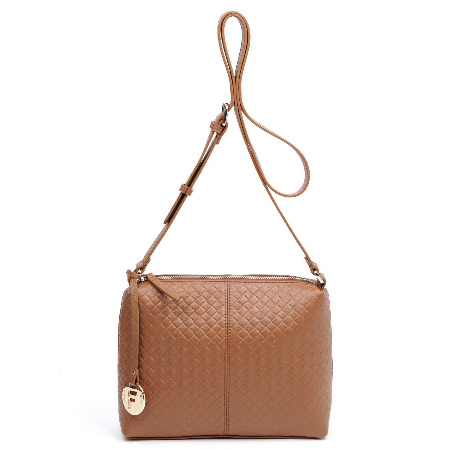 Стильная кросс-боди FABRETTI выполнена из натуральной зернистой кожи в светло-коричневом оттенке и декорирована тиснением, имитирующим плетение. Основное отделение закрывается на молнию с кожаным поводком. Внутри есть 2 боковых кармана для мелочей: открытый и на молнии. На тыльной стороне предусмотрен карман быстрого доступа на молнии. Круглая металлическая подвеска с силуэтом монограммы бренда гармонично дополняет дизайн изделия. Плечевой ремень регулируется по длине. Цвет фурнитуры - золото.