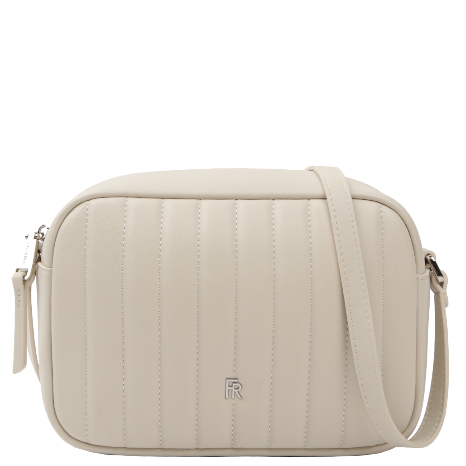 Стильная кросс-боди FABRETTI в светло-бежевом оттенке выполнена из натуральной гладкой кожи и декорирована геометрической стежкой. Основное отделение закрывается на полукруглую молнию с металлическим поводком. Внутри 2 боковых кармана для мелочей: открытый и на молнии. На тыльной стороне предусмотрен карман быстрого доступа на молнии. Лицевая сторона декорирована аккуратным шильдиком в виде монограммы бренда. Плечевой ремень регулируется по длине, ширина - 1,5 см. Цвет фурнитуры - серебро.