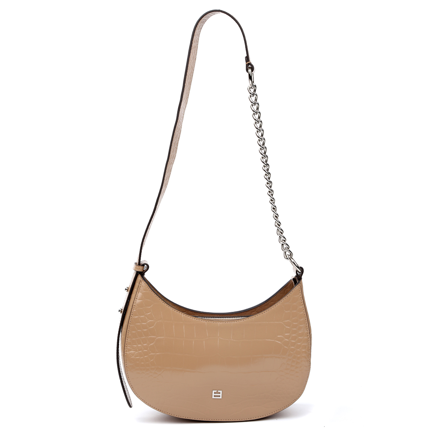 Стильная сумка на плечо FABRETTI выполнена из натуральной кожи в бежевом оттенке и декорирована тиснением под крокодила. Отлично держит форму. Основное отделение закрывается на молнию с металлическим поводком. Внутри 2 боковых кармана для мелочей: открытый и на молнии. Лаконичный дизайн модели дополняет миниатюрная монограмма бренда на лицевой стороне и плечевой кожаный ремень с вставкой из цепочки. Длина ремня регулируется. Цвет фурнитуры - серебро.
