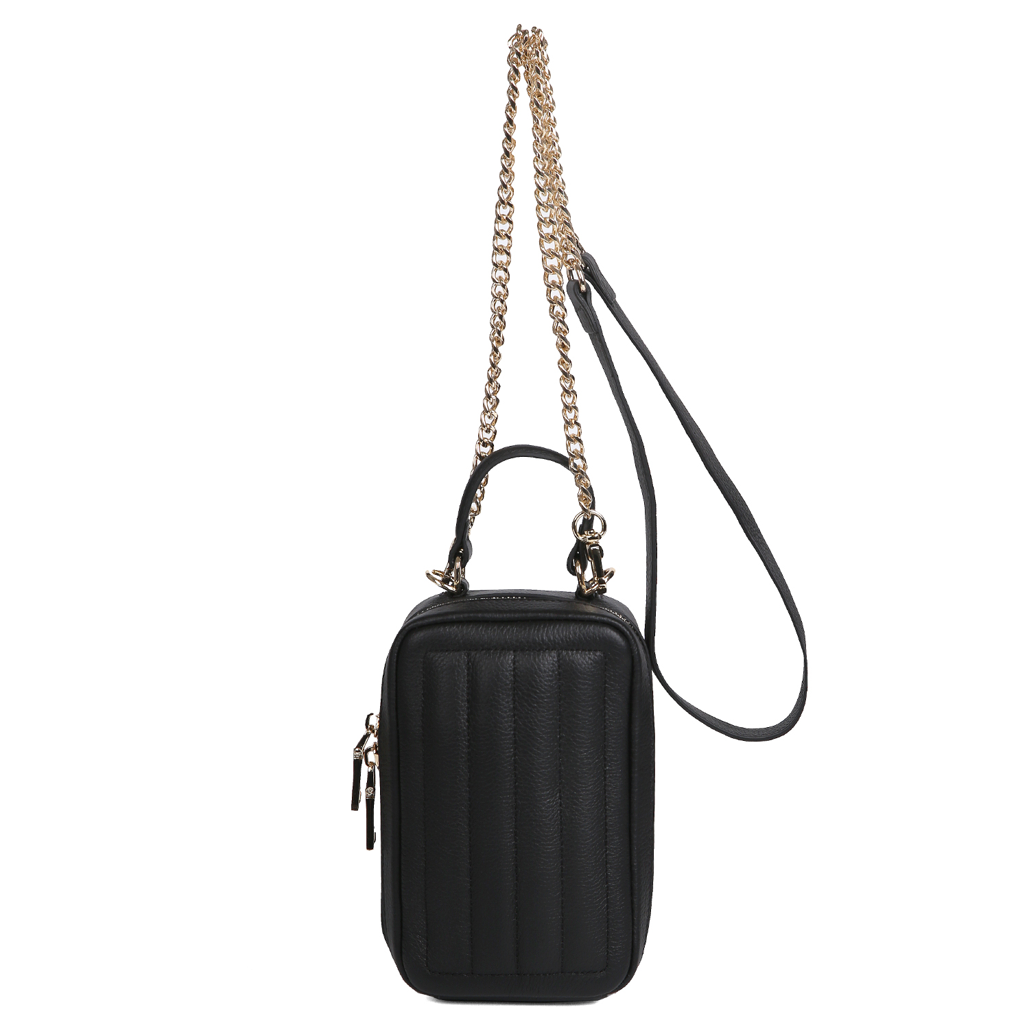 Компактная кросс-боди PALIO в черном цвете выполнена из натуральной кожи зернистой фактуры. Лицевая сторона декорирована стежкой. Сумка закрывается на полукруглую молнию с двумя удобными поводками. Внутри 1 открытый карман для мелочей. По бокам предусмотрены текстильные расширители. Съемный ремень-цепочка не регулируется по длине. Сверху есть ручка, которая позволяет носить аксессуар в руке, когда это необходимо. Фурнитура под золото гармонично дополняет дизайн изделия.
