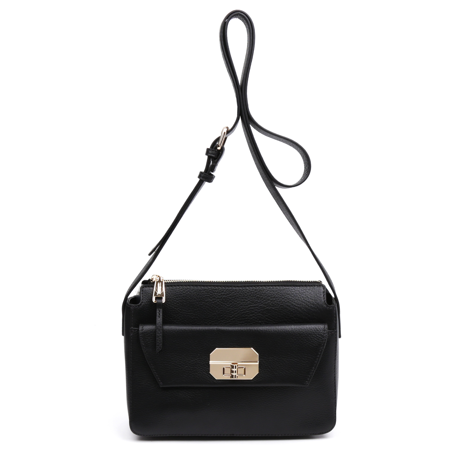 Стильная сумка через плечо FABRETTI подойдет тем, кто ценит компактность и практичность. Модель выполнена из натуральной зернистой кожи в черном цвете. Основное отделение закрывается на молнию с удобным кожаным поводком. Внутри предусмотрены 2 боковых кармана для мелочей: открытый и на молнии. На тыльной стороне есть карман быстрого доступа на молнии. На лицевой стороне расположен накладной карман, закрывающийся клапаном с поворотным замком. Плечевой ремень регулируется по длине. Цвет фурнитуры - золото.
