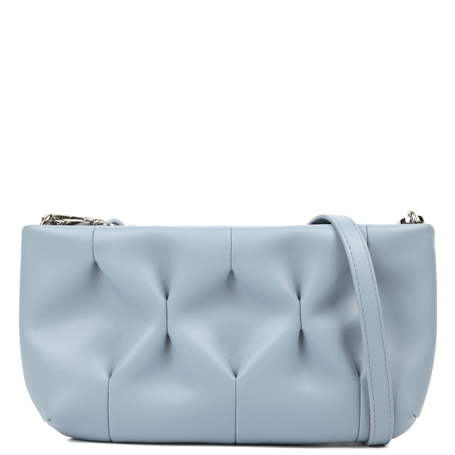 Миниатюрная кросс-боди FABRETTI в голубом оттенке выполнена из натуральной кожи нежной выделки и декорирована защипами, которые придают модели объем и формируют элегантные складки. Основное отделение закрывается на молнию. Внутри 2 боковых кармана для мелочей: открытый и на молнии. Плечевой ремень регулируется по длине, ширина - 1,5 см. При необходимости его можно снять, и тогда кросс-боди трансформируется в стильный клатч. Цвет фурнитуры - серебро.