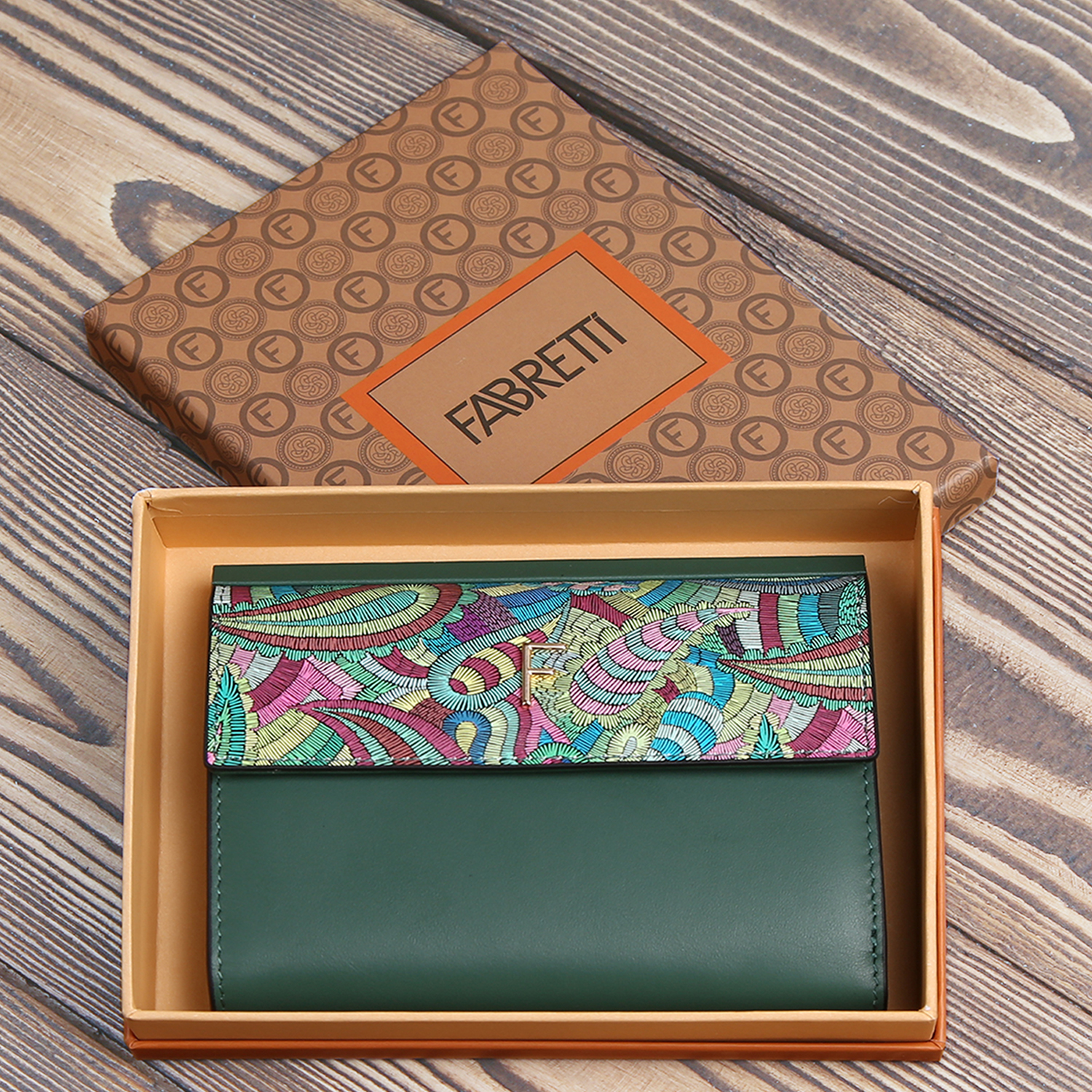 Компактный женский кошелек FABRETTI в зеленом оттенке выполнен из натуральной кожи гладкой фактуры и декорирован узором пейсли.