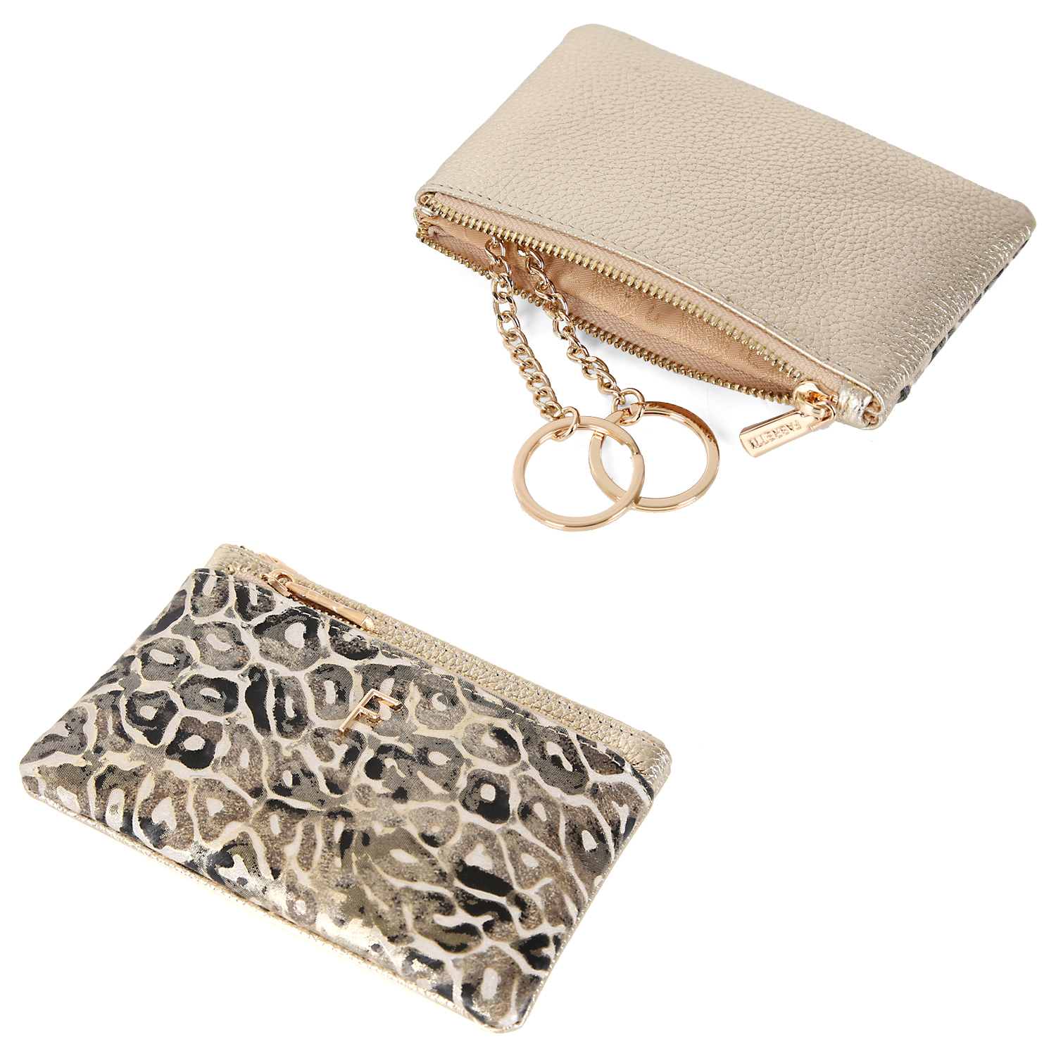 Модель имеет 1 отделение на молнии. Внутри есть 2 кольца-держателя на цепочке и открытый карман для дисконтных и кредитных карт. Внешний карман на молнии декорирован эффектным леопардовым тиснением и шильдиком с логотипом бренда, вмещает банковские карты и другие необходимые мелочи. Цвет фурнитуры – золото.
