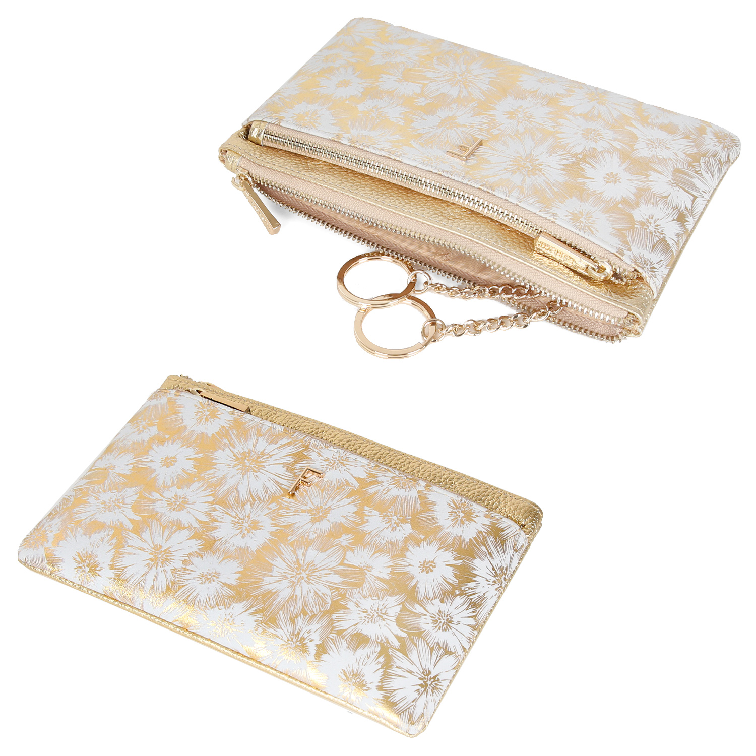 В аксессуаре одно отделение для ключей с 2 кольцами-держателями на цепочке и боковым карманом для банковских карт. На лицевой стороне – вместительный карман на молнии для купюр и разных мелочей. На тыльной стороне также предусмотрен вместительный карман на молнии. Фурнитура под золото гармонично дополняет дизайн изделия.