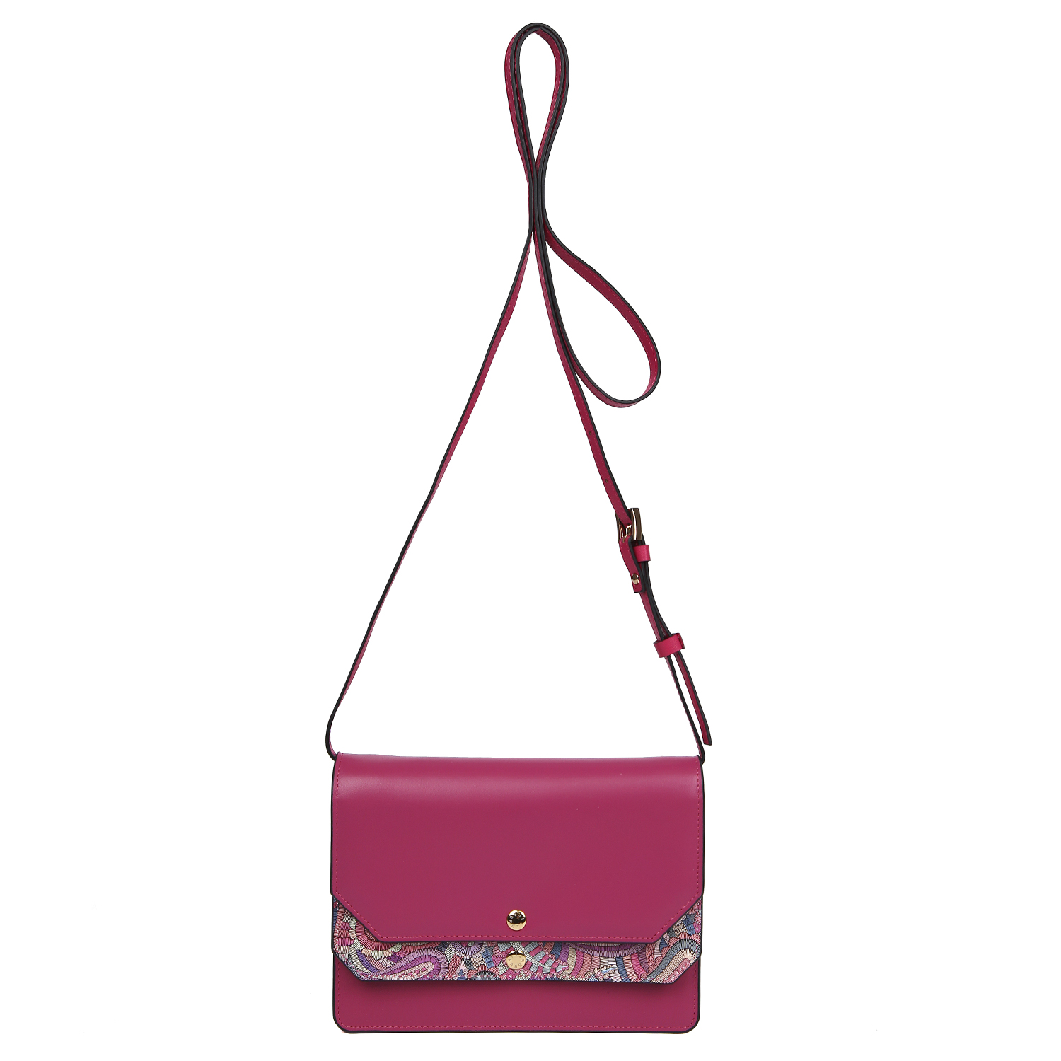 Компактная сумка-клатч FABRETTI в оттенке фуксии выполнена из натуральной гладкой кожи и декорирована принтом пейсли. Основное отделение закрывается клапаном на кнопке. Внутри боковой карман на молнии. На лицевой стороне предусмотрен карман, который также закрывается клапаном на кнопке. На тыльной стороне есть вместительный карман быстрого доступа. Съемный плечевой ремень регулируется по длине. Модель можно использовать как кросс-боди, так и в качестве клатча. Цвет фурнитуры - золото.