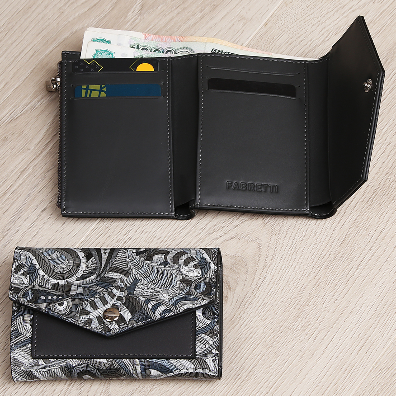 Женский кошелек FABRETTI в сером цвете вполне можно назвать идеальным, поскольку он легко помещается в повседневную сумку и объединяет функциональность и стиль. В качестве декора выступает эффектный принт пейсли.