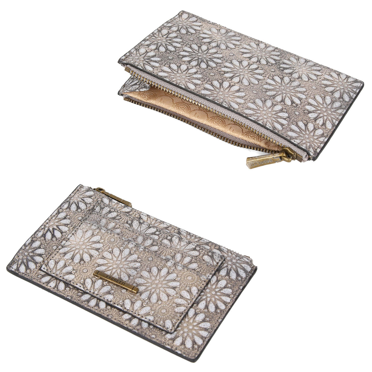 Плоская женская визитница FABRETTI занимает минимум места и незаменима, когда нужно взять несколько банковских карт и какие-то мелочи. Модель выполнена из натуральной металлизированной кожи с эффектным фактурным тиснением. Удобно размещается в руке, приятна на ощупь.