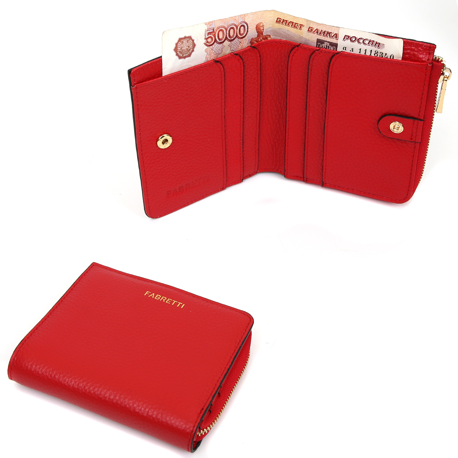 Компактный женский кошелек FABRETTI выполнен из натуральной зернистой кожи в классическом красном цвете.