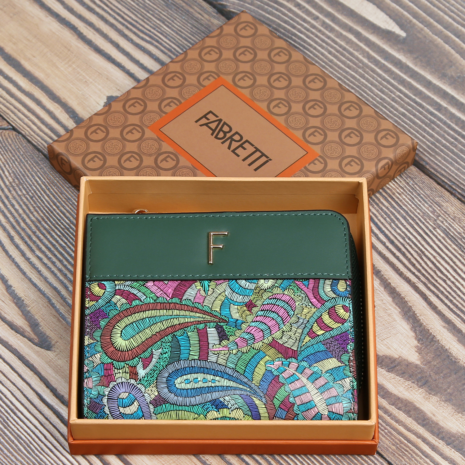 Компактный женский кошелек FABRETTI в зеленом цвете выполнен из натуральной гладкой кожи и декорирован эффектным принтом пейсли.