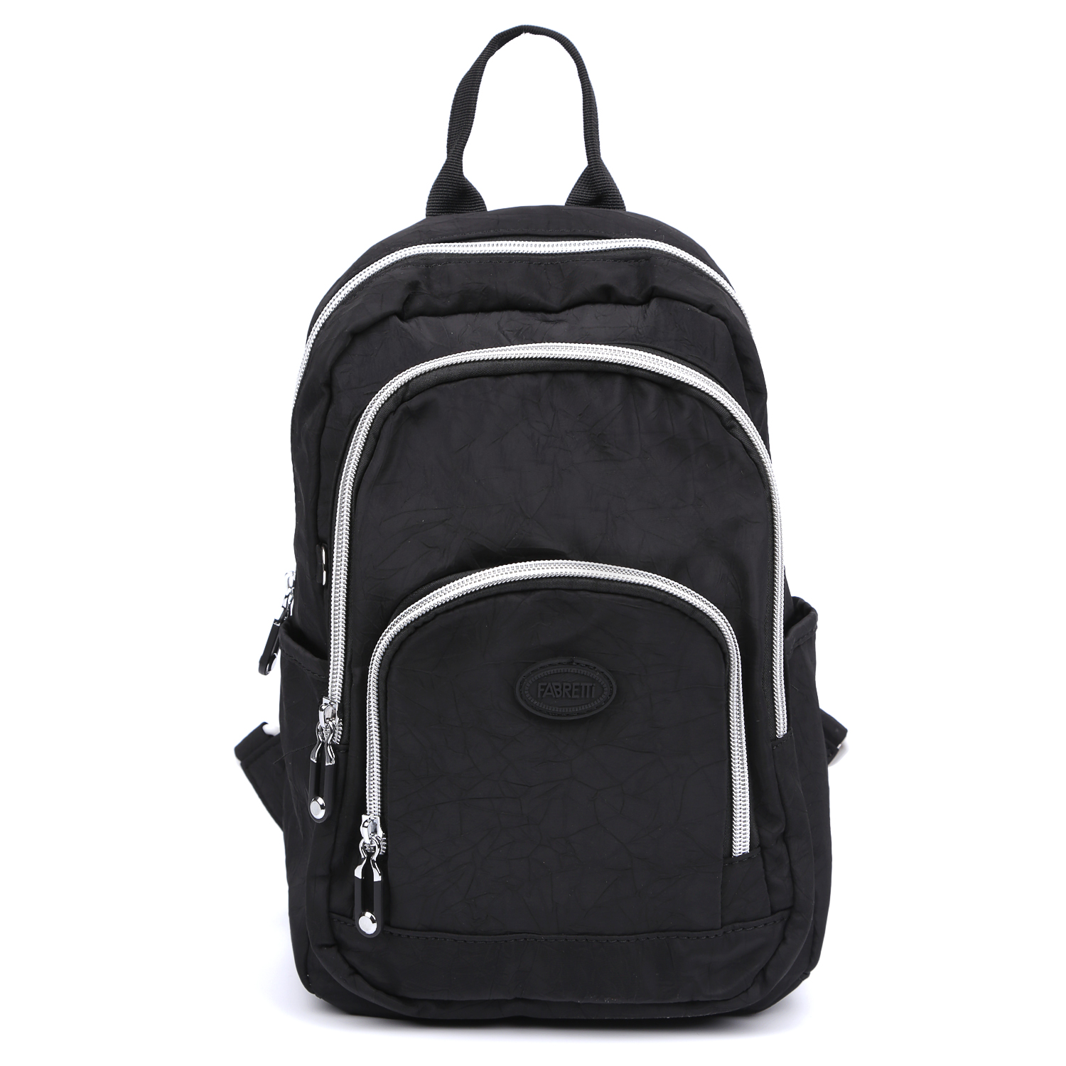 Удобный текстильный рюкзак FABRETTI в черном цвете выполнен из высокотехнологичного влагостойкого полиэстера жатой фактуры. Он практичен и прост в уходе. Основное отделение закрывается на полукруглую молнию с удобным поводком. Внутри 3 кармана для мелочей: 2 открытых и на молнии, а также дополнительная секция, куда поместится планшет или электронная книга. На лицевой стороне расположены 2 вместительных кармана на молнии. По бокам есть открытые карманы. На тыльной стороне предусмотрен вертикальный карман быстрого доступа на молнии. Две лямки регулируются по длине и, благодаря молнии, превращаются в одну. Рюкзак станет незаменимым аксессуаром в любой поездке, а также гармонично впишется в стиль casual.