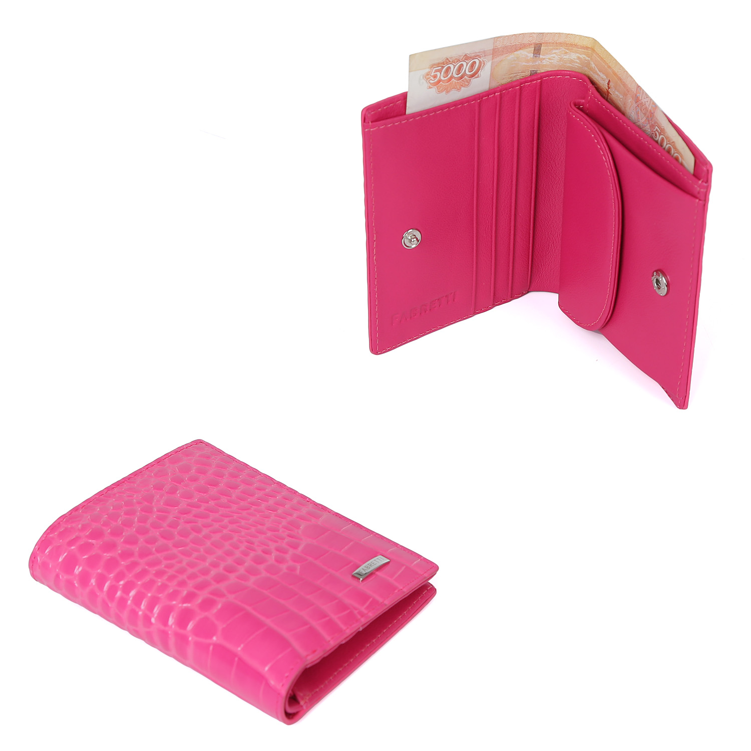 Женский компактный кошелек от итальянского бренда Fabretti в розовом цвете выполнен из натуральной кожи с тиснением под рептилию. Аксессуар имеет 1 отделение для купюр, карман для монет и 5 карманов для дисконтных и банковских карт, закрывается на кнопку. Фурнитура под серебро.