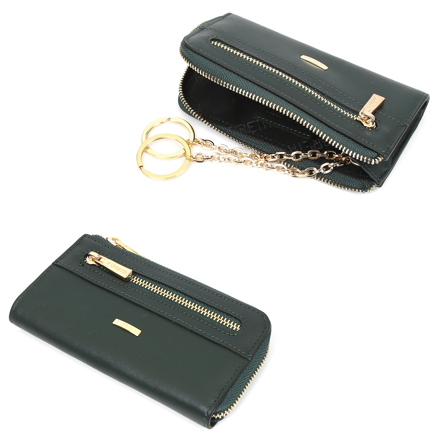 Плоская вместительная ключница FABRETTI позволяет хранить все ключи в одном месте и не терять их в большой сумке. Натуральная гладкая кожа, темно-зеленый цвет и фурнитура под золото делают модель невероятно актуальной.