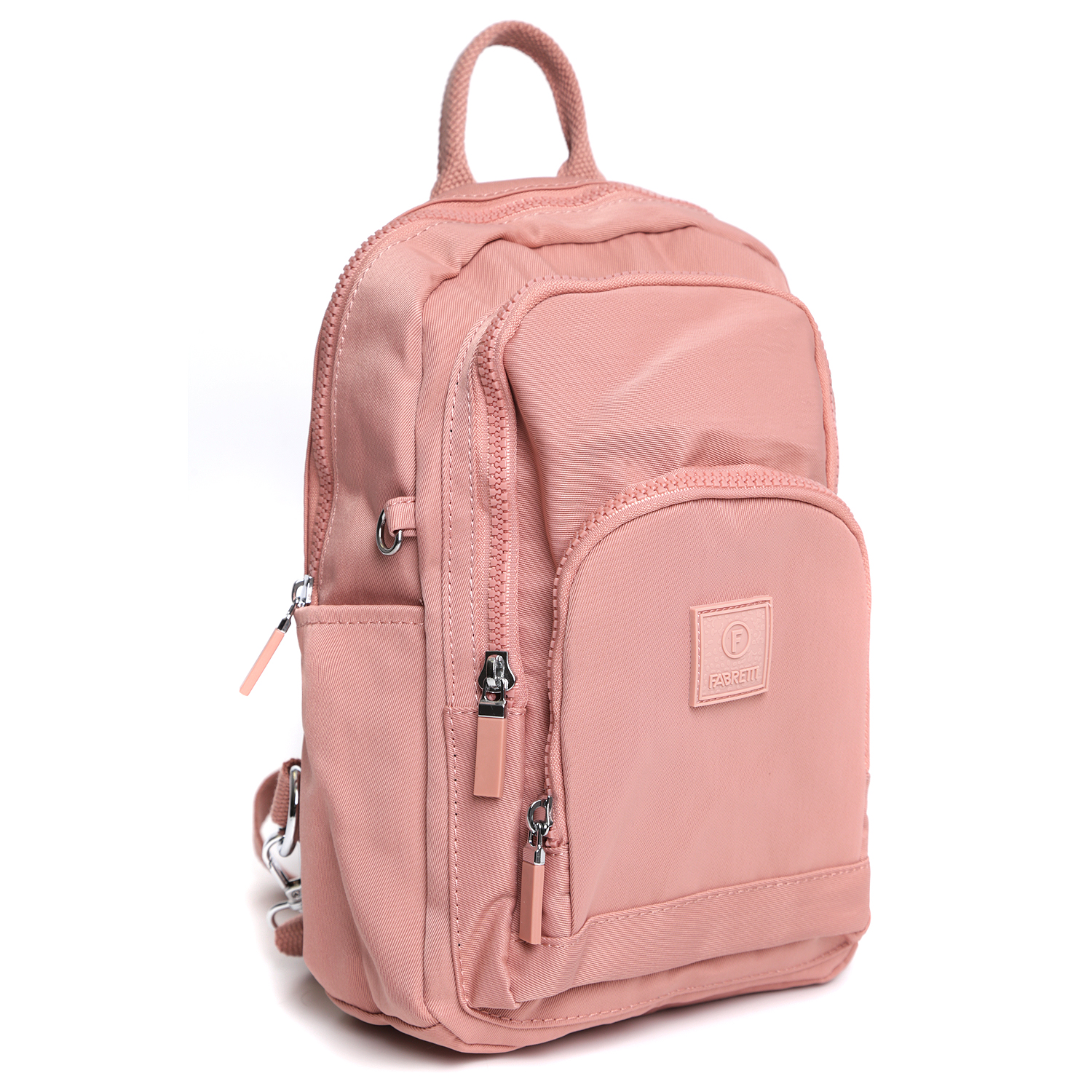 Компактный текстильный рюкзак FABRETTI в розовом цвете выполнен из высокотехнологичного влагостойкого полиэстера. Он практичен и прост в уходе. Модель имеет продуманную систему хранения. Предусмотрены 2 отделения (большое и поменьше), каждое из которых закрывается на полукруглую молнию с удобным поводком. Внутри большого отделения есть 2 боковых кармана для мелочей: открытый и на молнии. На лицевой стороне находится полукруглый карман на молнии. По бокам есть 2 открытых кармана. На тыльной стороне предусмотрен вертикальный карман быстрого доступа на молнии. Две текстильные лямки регулируются по длине, соединяются в одну с помощью молнии. Система крепления лямок позволяет носить аксессуар несколькими способами: традиционно на спине или в качестве слинга. Сверху предусмотрена небольшая ручка, за которую можно носить аксессуар в руке.
